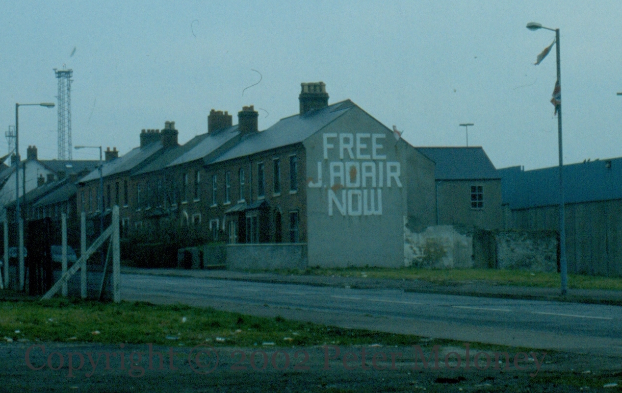 Adair’s ambitions brought him into conflict with the UVF, whom he tried to drive out of the lower Shankill (and Highfield). At least seven died in the feud, including the UDA’s Jackie Coulter (see below) and the UVF’s Sam Rockett (X07011). (Various of Adair’s gang relocated to Glenbryn and were a cause of the Holy Cross dispute in 2001 and 2002 (BelTel).) Adair was returned to prison in August, 2000. While imprisoned, several “Free J Adair” murals appeared (in various parts of Belfast and in the LVF’s strongholds in Lurgan) and some more new murals. He remained in prison until May 2002.