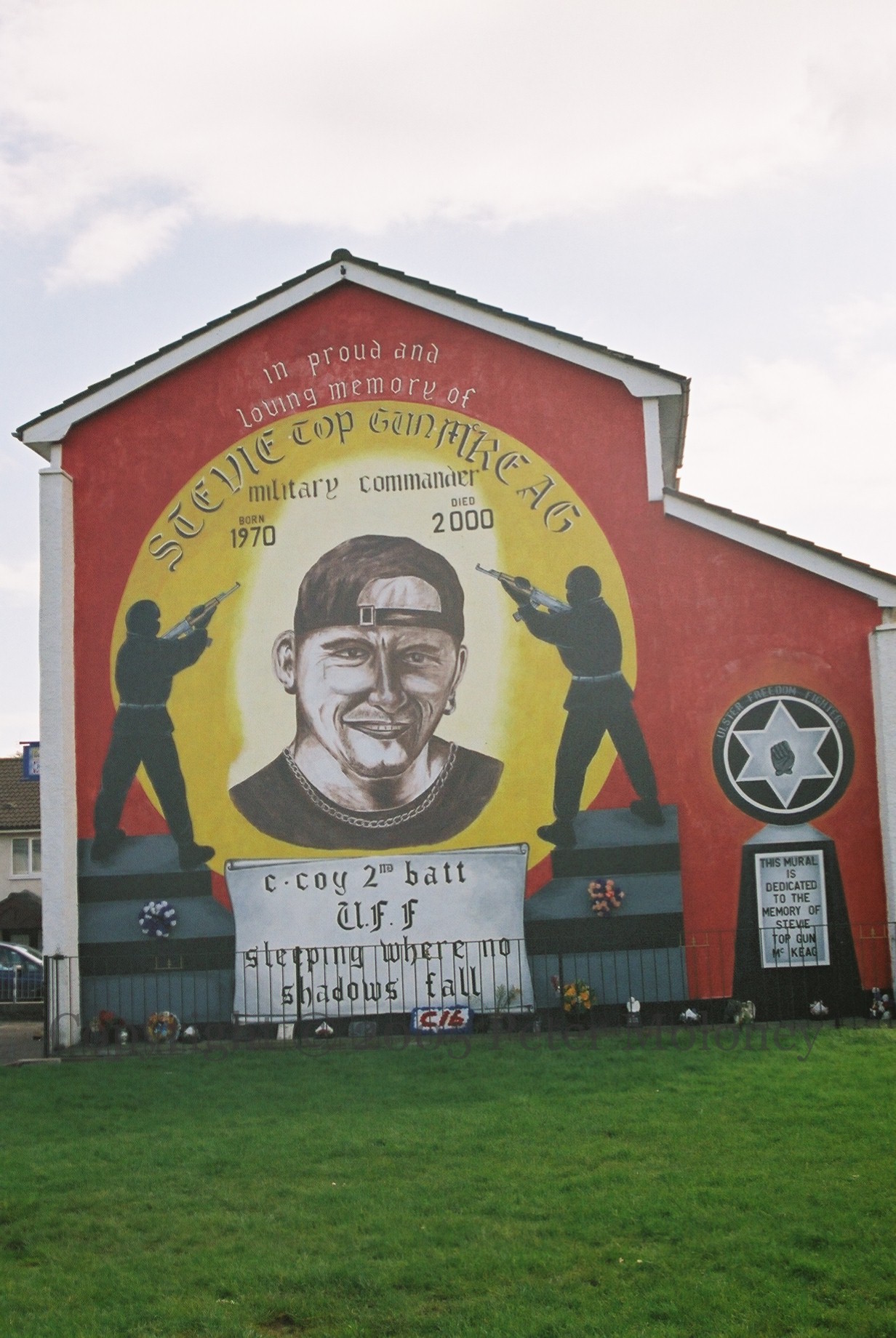 Adair was convicted of directing terrorism in 1995 (Guardian) but released from prison in September 1999 under the Agreement. In 2000 an astonishing number of murals – at least 18 large pieces and several smaller ones – were painted in Adair’s lower Shankill stronghold, and a few more were added in 2001 and 2002.
