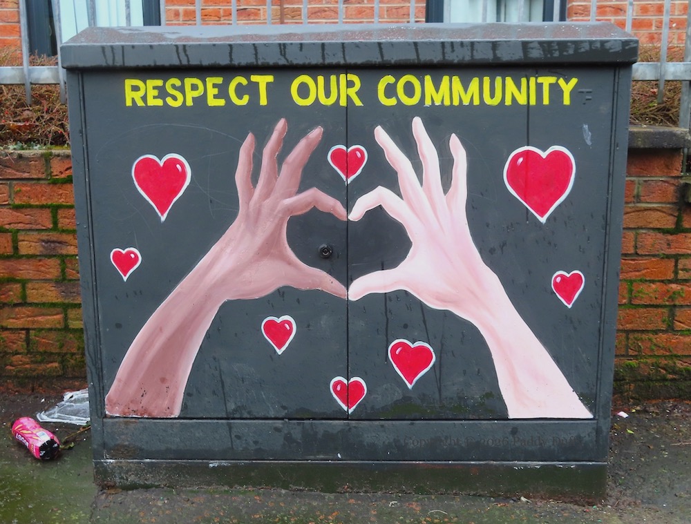 There are a few early examples of painted boxes but the practice was made mainstream in Belfast with the “Belfast Canvas” programme supported by Belfast City Council in 2019 . A number of artists painted boxes that year on May 6th, the day after the 2019 Hit The North (a street art festival), and more artists were subsequently hired to add more, such as Danni Simpson in the summer of 2021 (Belfast Live ) and Rob Hilken in March 2022 (Rob Hilken ). For the first few years (2019-2022), the painted boxes were in the city centre. In 2023, a few were painted along the Antrim Road, including in the CNR New Lodge and middle-class stretch of the arterial route. A third round of painting took place in late 2024 and 2025, again mostly in the city centre and middle-class areas.