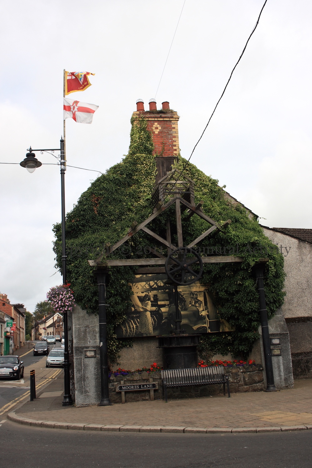 Sculptor Anna Cheyne (WP) produced the piece ‘My Lady Of The Chimney-Corner’ for Antrim Council in 1998, inspired by the domestic and farming scenes in the 1913 book of the same name by Antrim native Alexander Irvine. The book is subtitled “A story of love and poverty in Irish peasant life” – Irvine’s parents were in a mixed marriage. (You can read the book at Project Gutenberg or at Google Books).