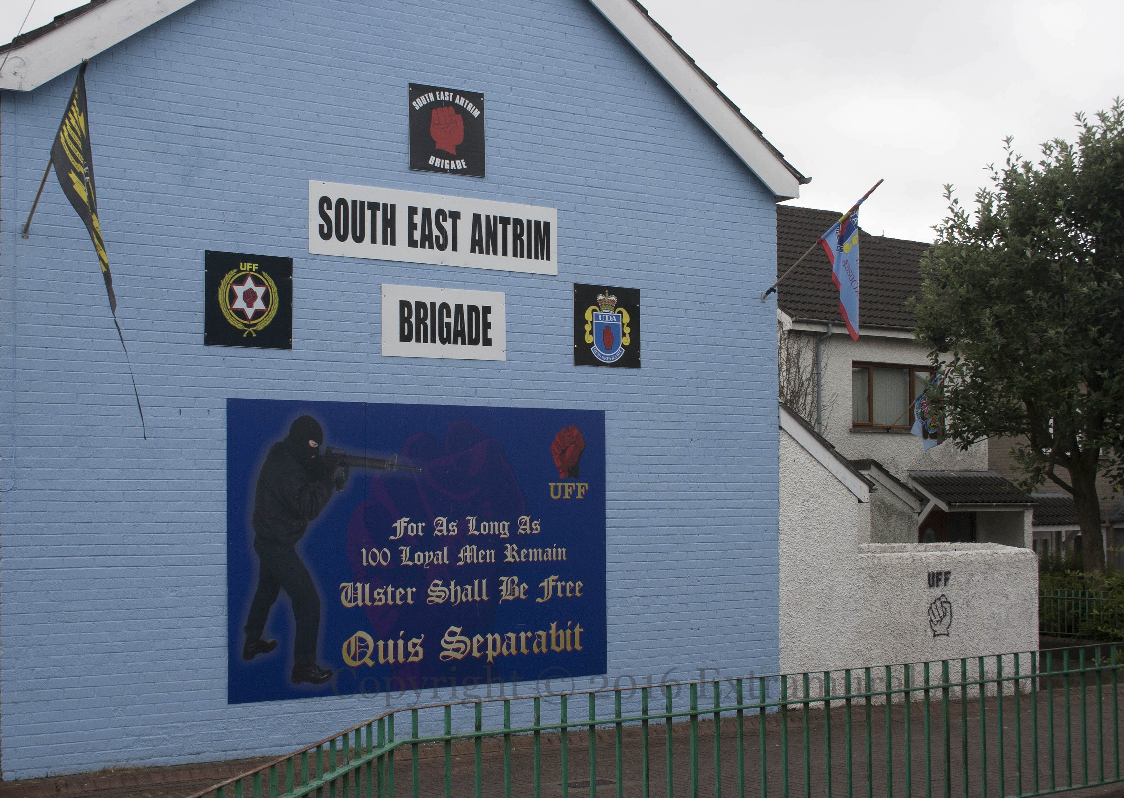 New South East Antrim UDA/UFF mural in Ballyclare, with the usual emblems and a central board featuring a photograph of a balaclava’ed volunteer: “For as long as 100 loyal men remain Ulster shall be free – Quis Separabit”.