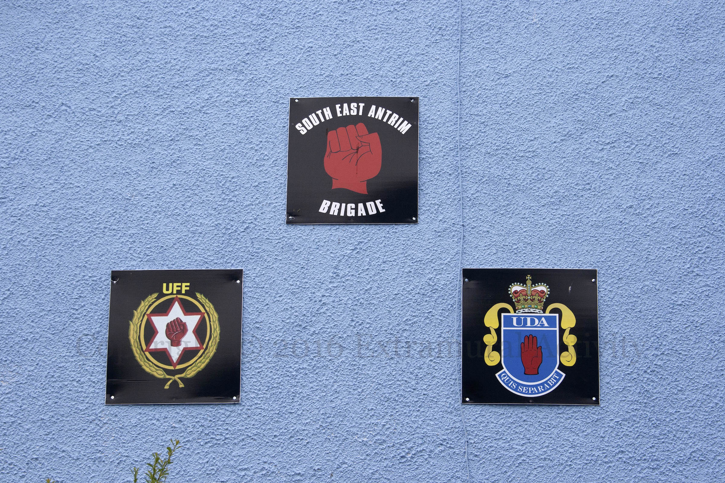 Writing has appeared alongside the “Show No Mercy Expect None Back” mural in Ballyclare. On one side : “We will never accept [was originally “except” but this was quickly changed] a united Ireland – Feriens Tego [the UFF motto]” and “Now entering loyalist Erskine/Rashee Park – Quis separabit [the UDA motto]” and on the other: “Ballyclare heartland of south east Antrim – Simply the best [used with both UDA and UFF]”