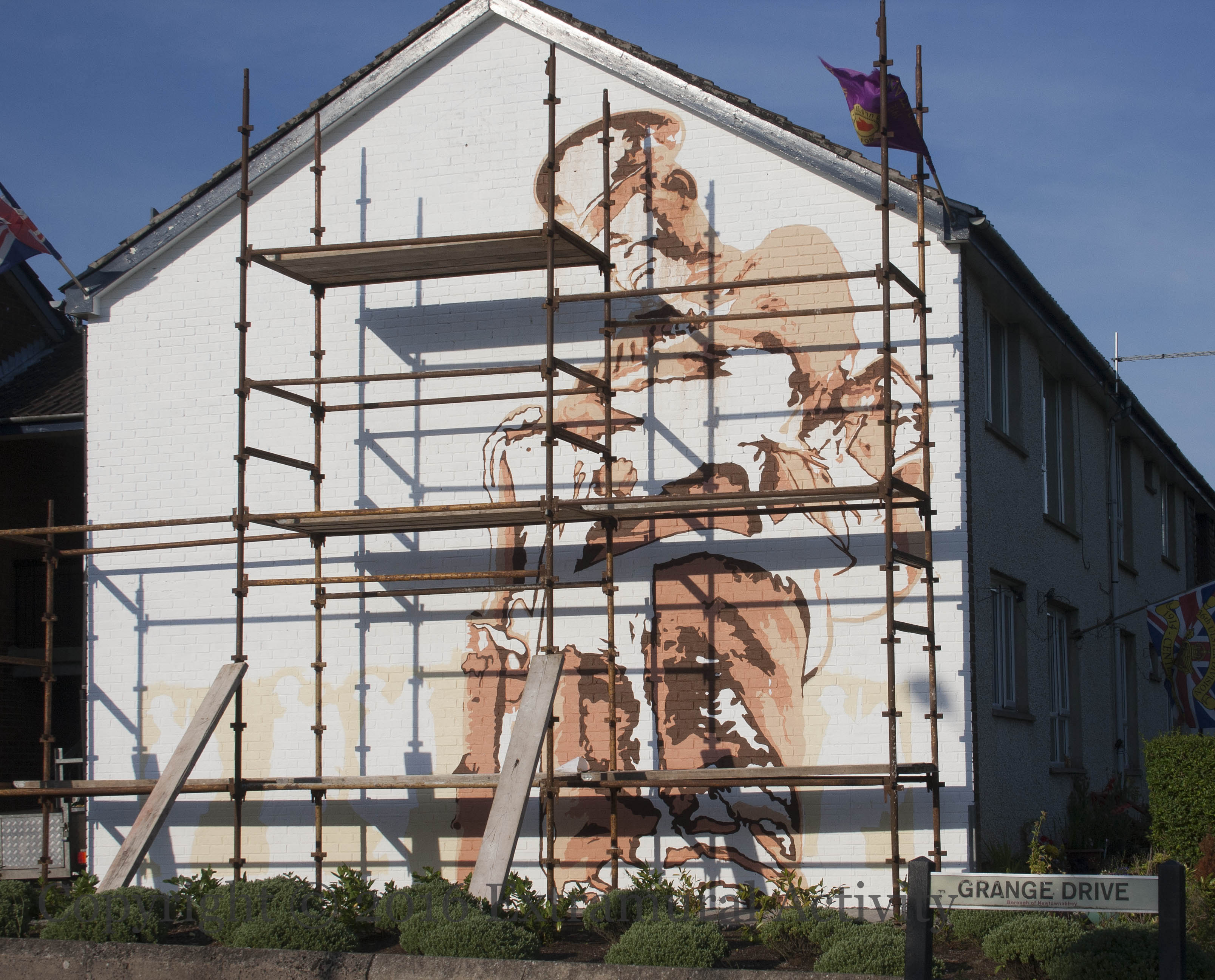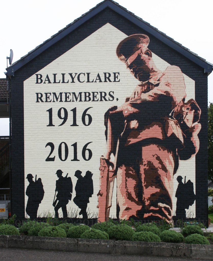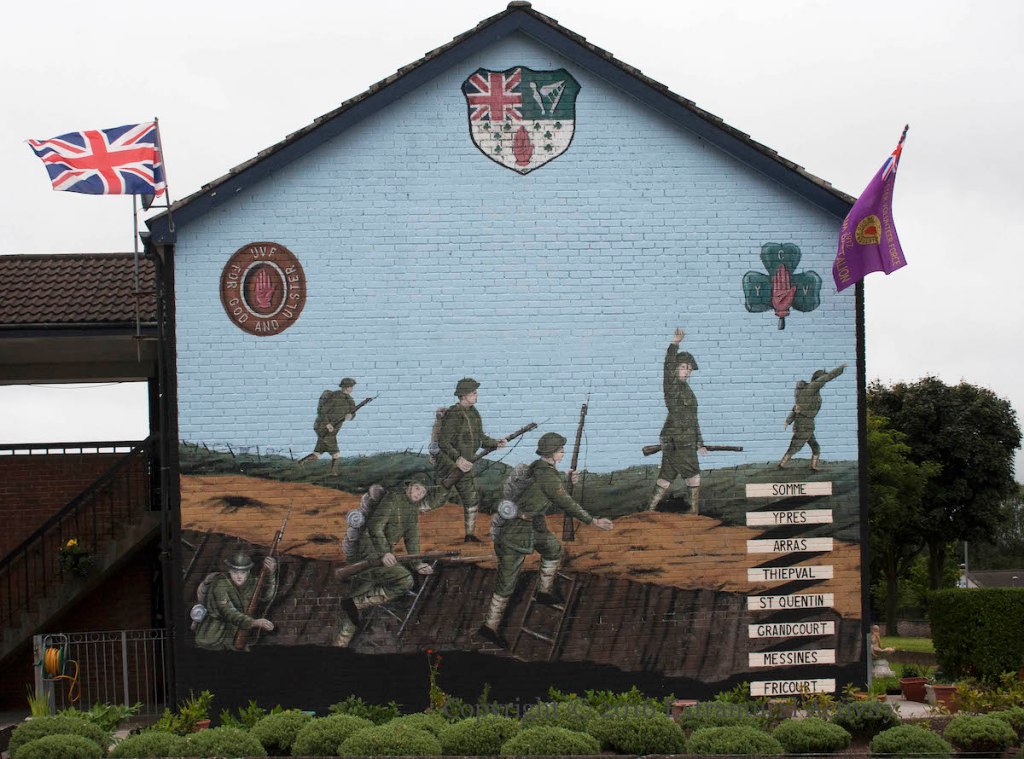 The ‘over the top’ mural in Ballyclare has been refreshed, compared to the faded lettering of 2014: the list of battles has been restored (in the bottom right) but the large scroll in the centre has been painted over.