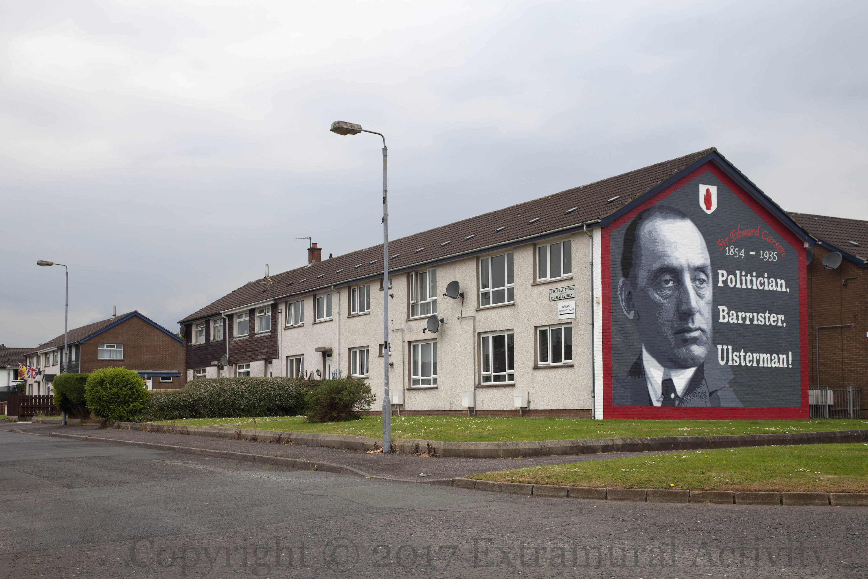 Sir Edward Carson, 1854-1935, was born and raised in Dublin, and practiced law there for many years, but he is most famously associated with the Unionist campaign against Home Rule and the creation of “a Protestant province of Ulster” and eventually the six-county state of Northern Ireland. The new mural in today’s post is by Dee Craig in Ballyclare’s Grange Drive.