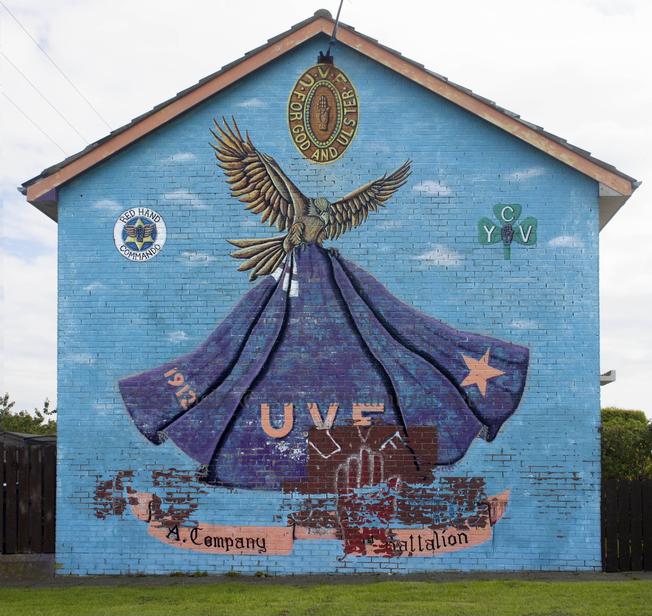 Here are three images of Red Hand Commando boards and flags in the Bloomfield estate. They both feature a red hand with eagle’s wings over a six-pointed star and on the flag, the motto (in crude Gaelic) “Lamh Derg Abu” – “Onward, Red Hand” or “Red Hand To Victory”. The loyalist paramilitary group declared an official end to activities in 2007 (BBC-NI) and decommissioned its weapons by 2009.