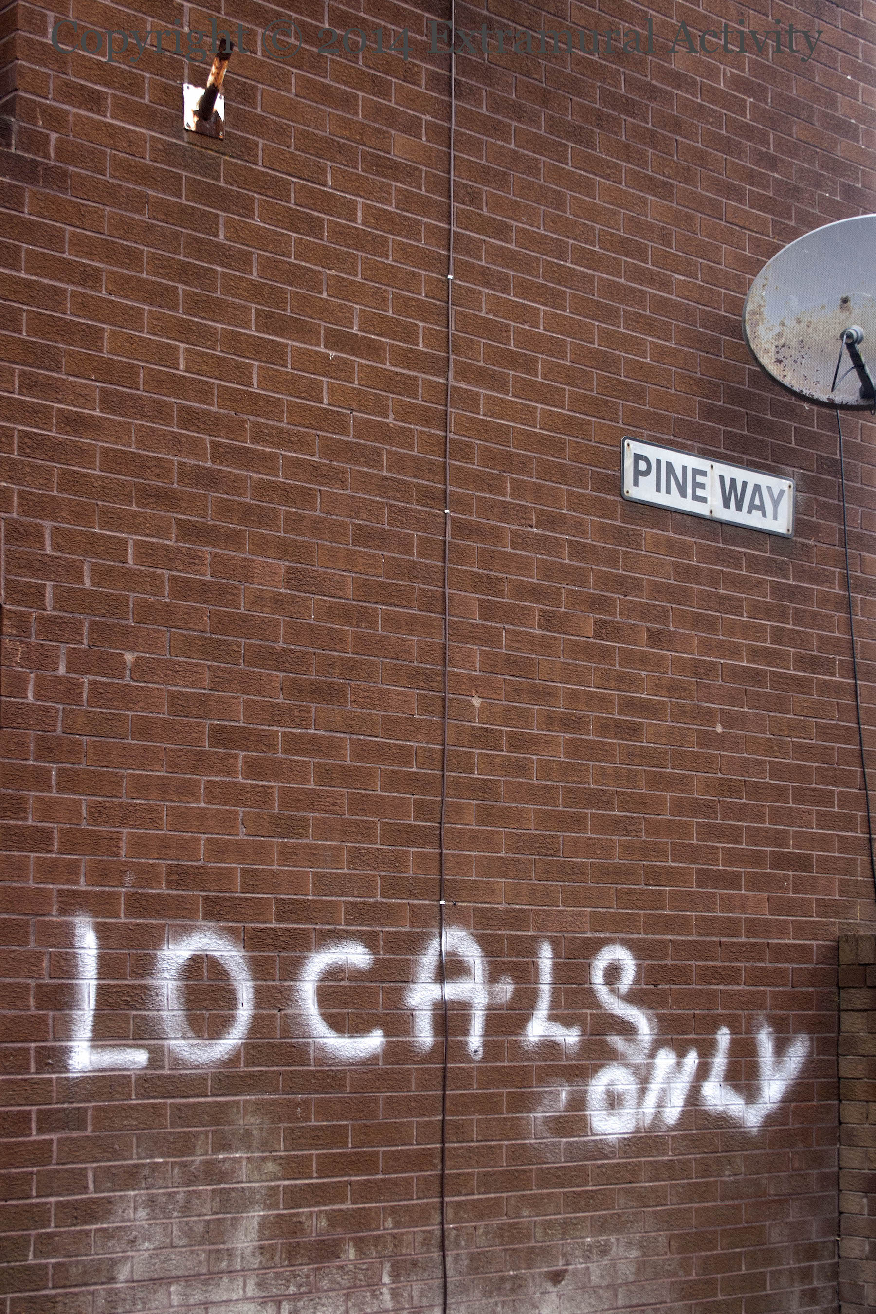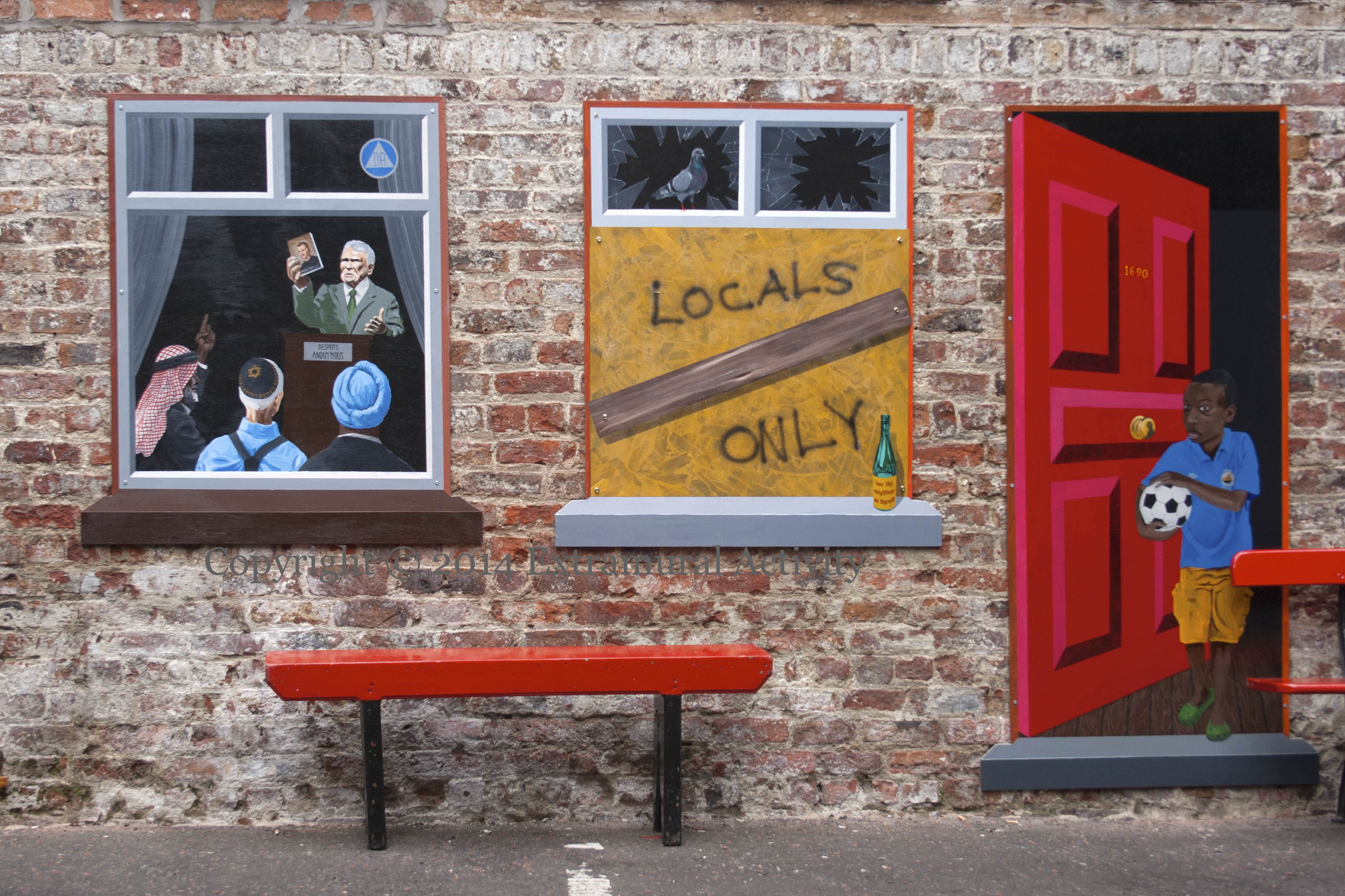 Pastor James McConnell, who denounced Muslims as “satanists” back in May at the Whitewell Metropolitan Tabernacle, is finally seeking help, attending “Despots Anonymous” in the company of a Muslim, a Jew, and a Sikh. The group meets next door to 1690, home to a football-loving boy from a family of immigrants who are under attack because the housing is for “locals only” – see the final image for just such a graffito in Pine Way. The bottle of Buckfast preaches “Love thy neighbour as thyself”.