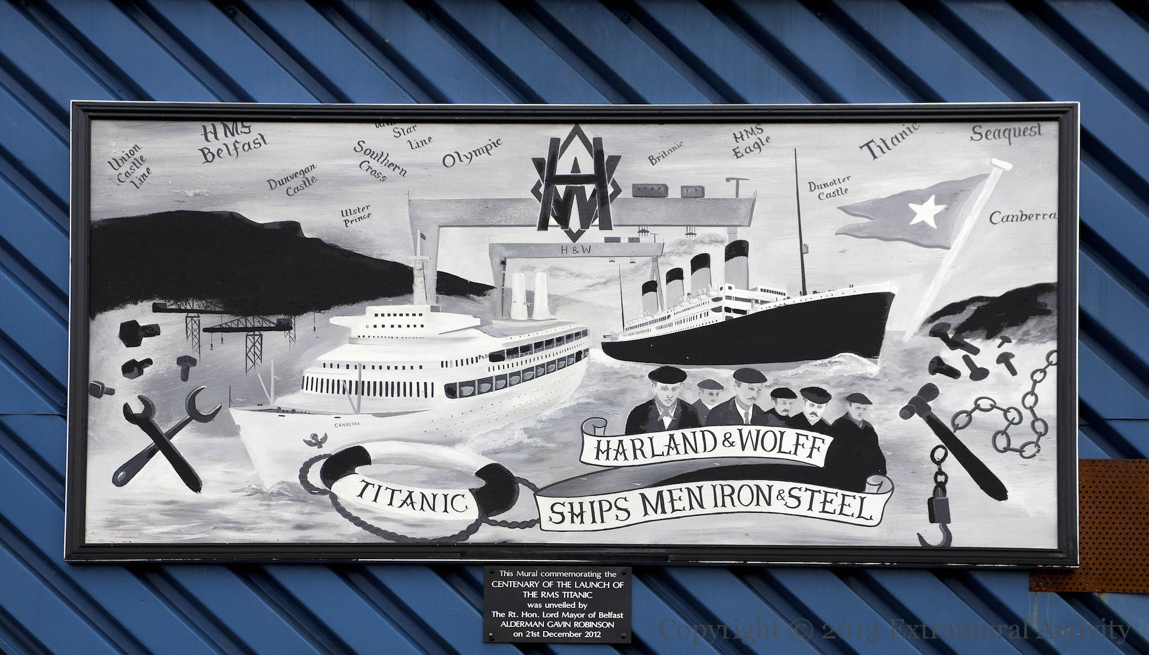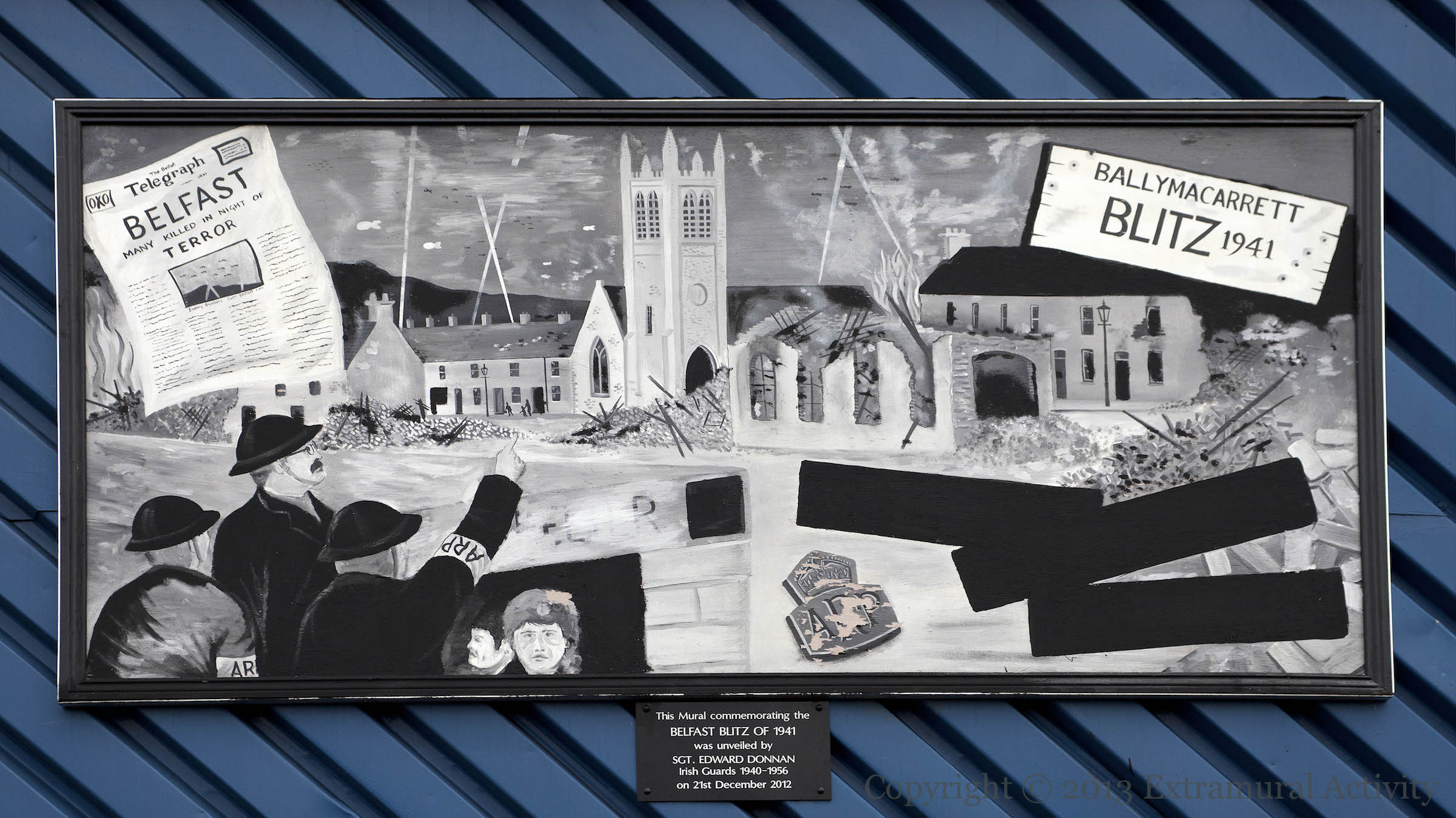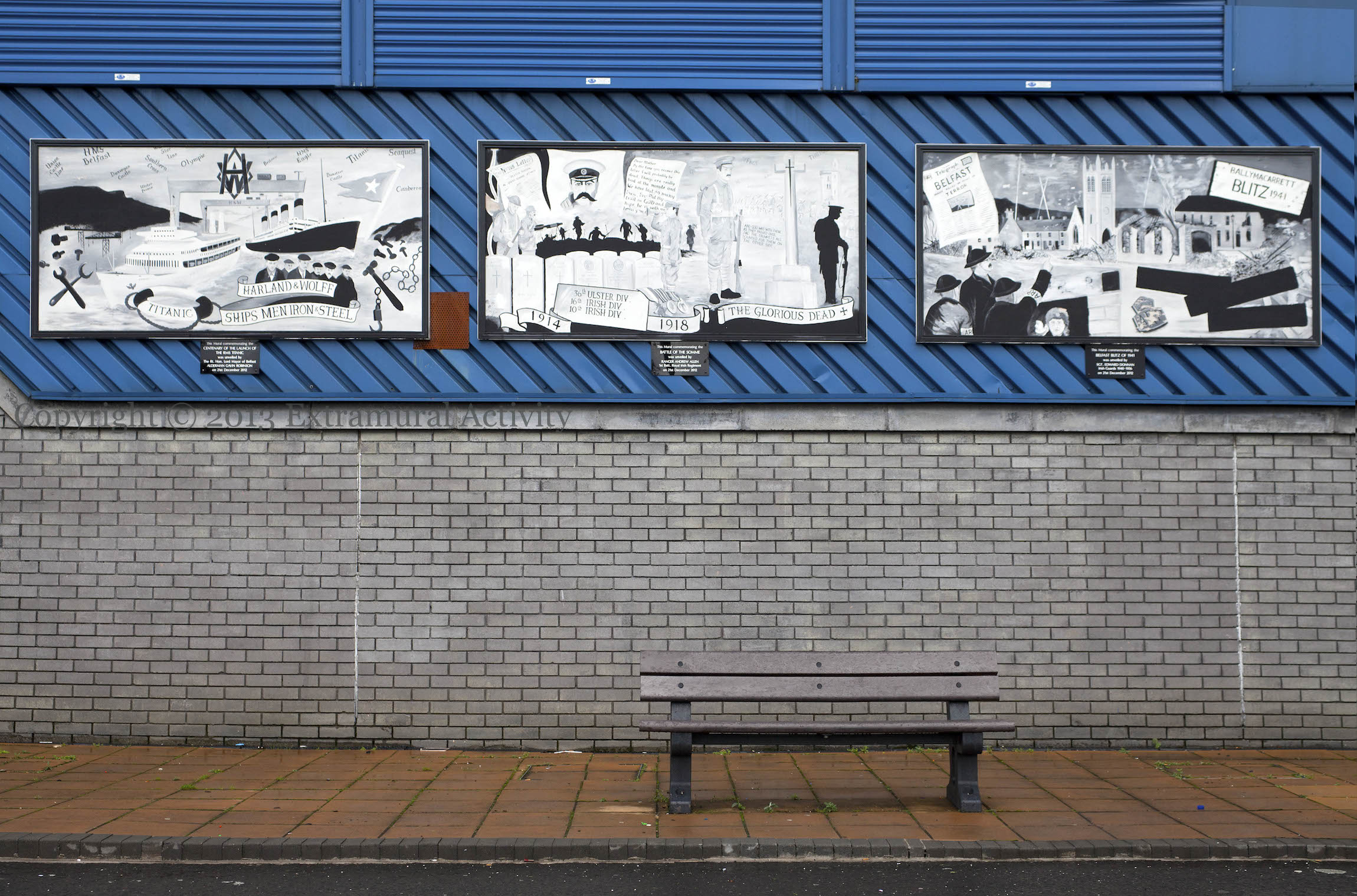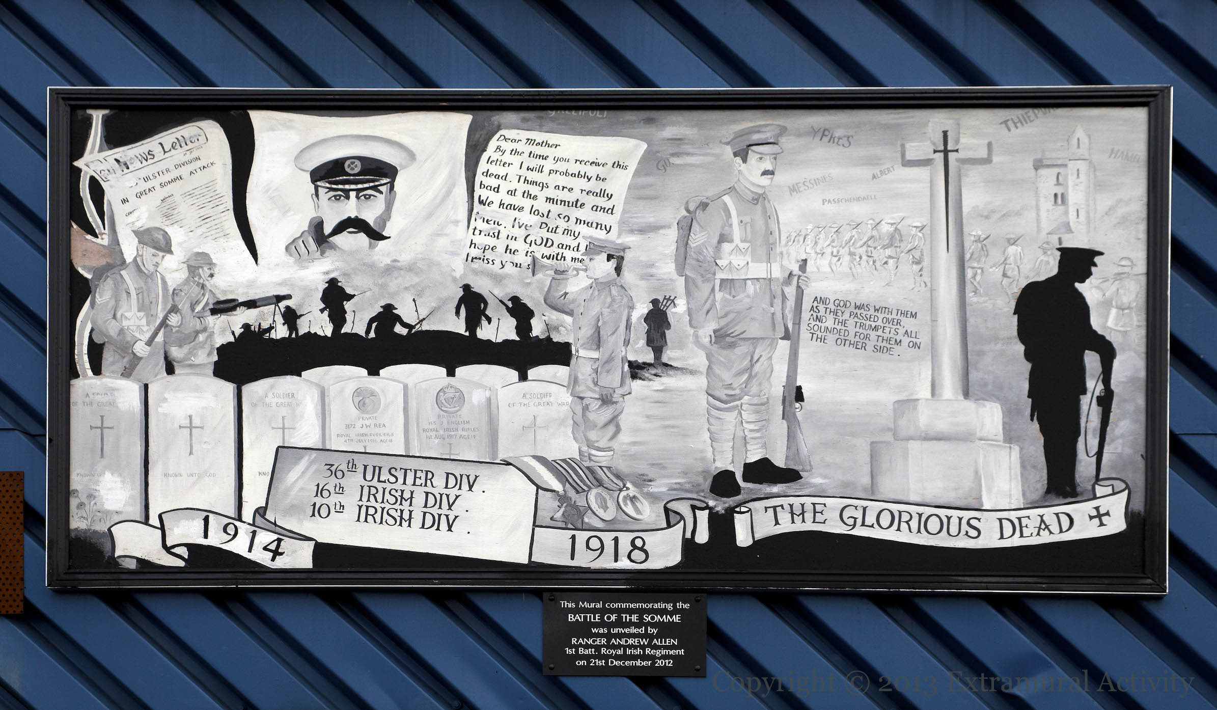 These three painted boards, in frames, on the exterior of the Connswater Community Centre, were unveiled this past December (2012). The first commemorates Titanic, the second the Somme, and the third the WWII Blitz.