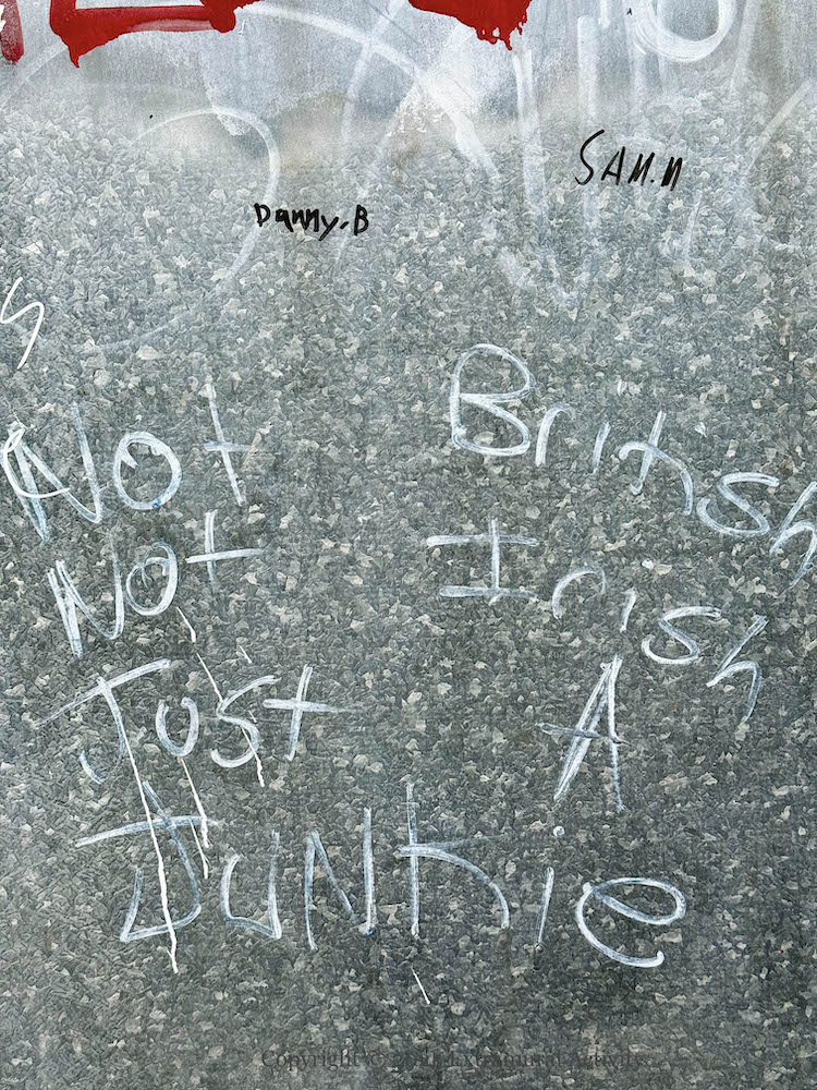 This mural celebrates the Irish-language institutions in west Belfast. From left to right, the buildings by the loch are: Gaeltacht Bhóthar Seoıghe, Bunscoıl Phobal Feırste, Raıdıó Fáılte, An Chultúrlann, Teach Ard Na bhFeá, Coláıste Feırste, and Áras Na bhFál. In a sense they are all ripples from the initial drop that was the Shaw’s Road Gaeltacht, established in 1969 and which led quickly to the bunscoıl in 1971 (WP). The NVTv documentary about the Shaw’s Road gaeltacht borrows its title from the slogan motivating the early efforts, “Ná habaır é, déan é” [Don’t say it, do it] – the bunscoıl was not officially recognised until 1985.