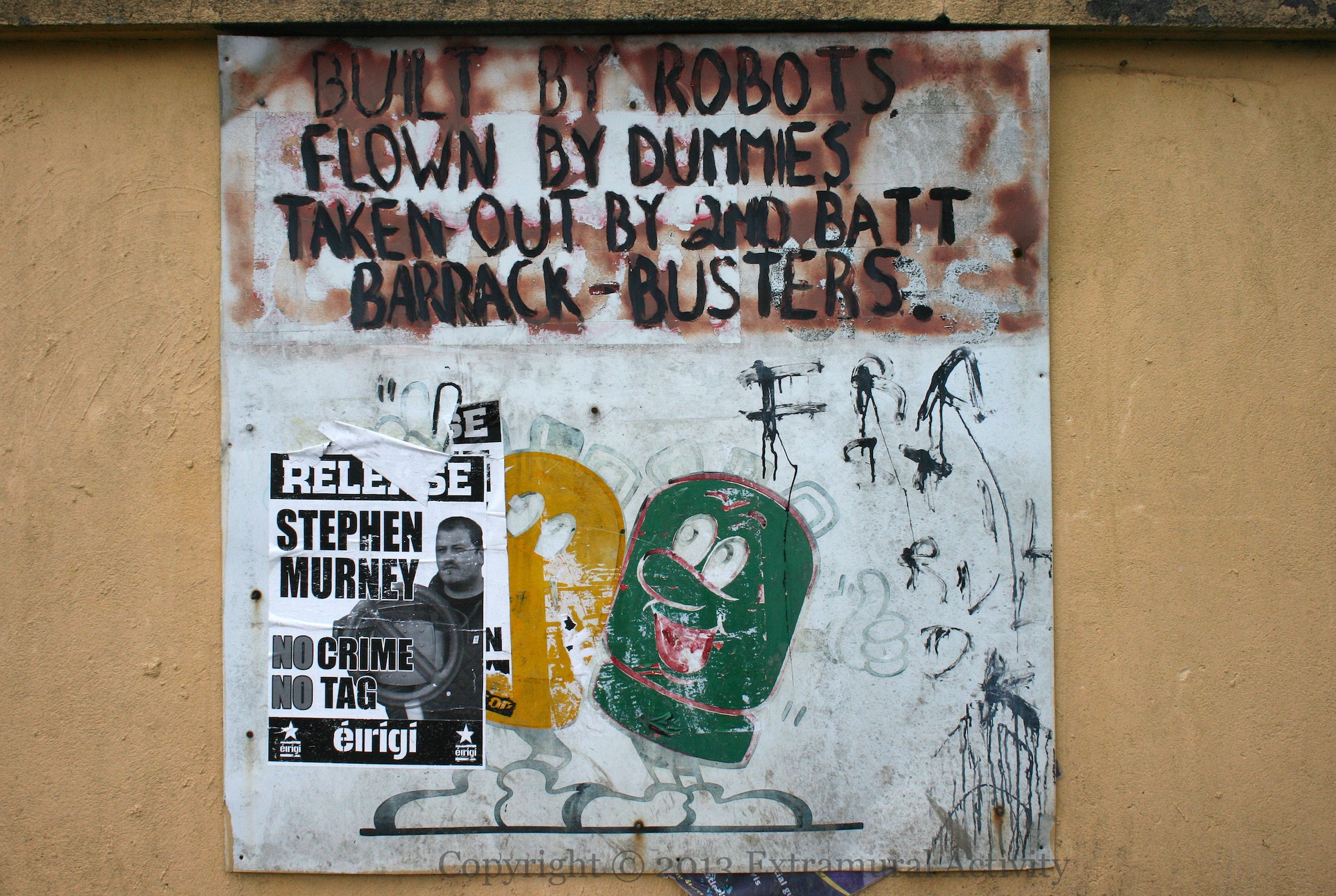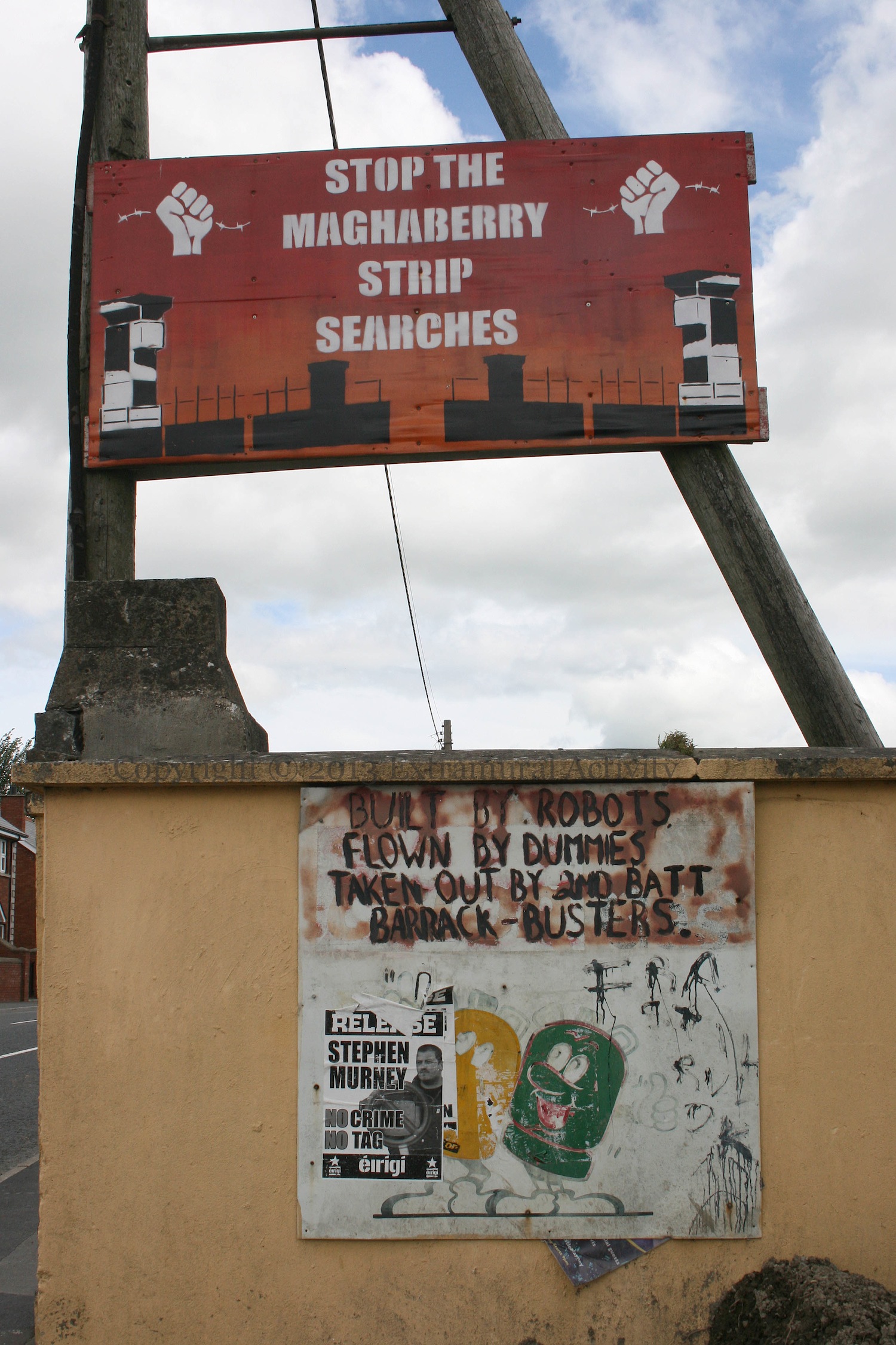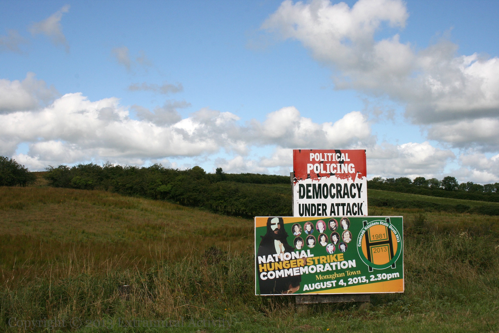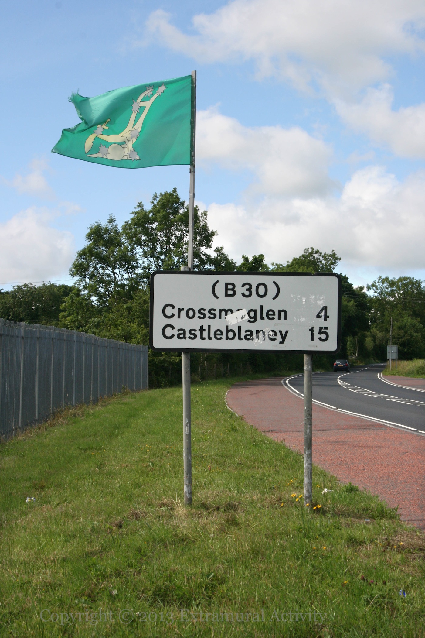 Two images today from the crossroads at the intersection of Crossmaglen-Newry and Newtownhamilton-Dundalk roads (a.k.a. Ford’s Cross, Silverbridge). The first shows a hunger-strikers board from this year over a much older ‘democracy under attack’ board (see D02009). The second shows the plough and the stars flying above the mileage sign. There is also a memorial, with a tricolour flying overhead, at this crossroads