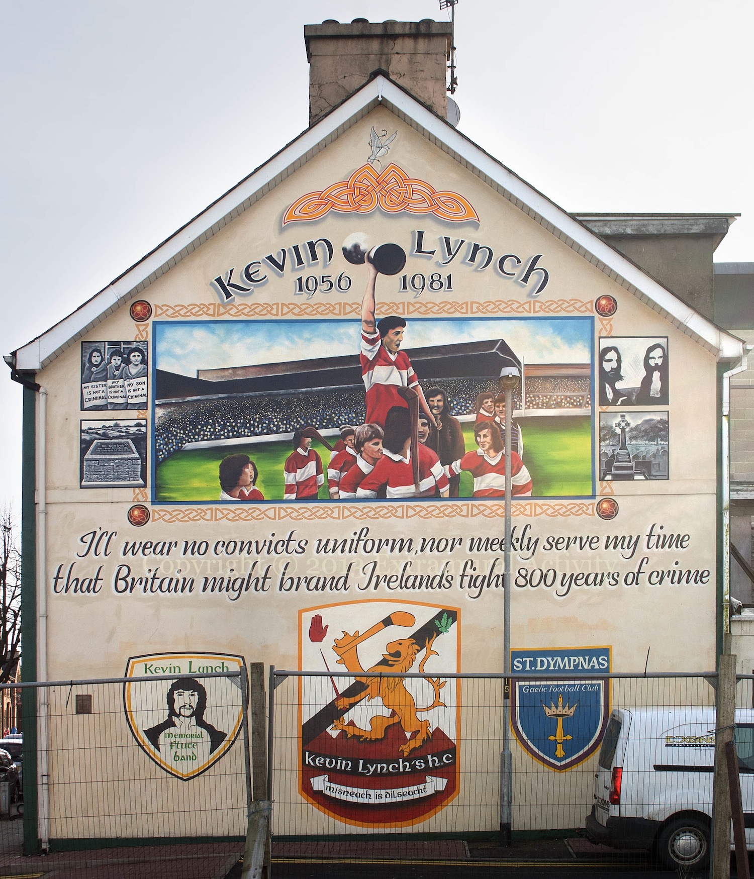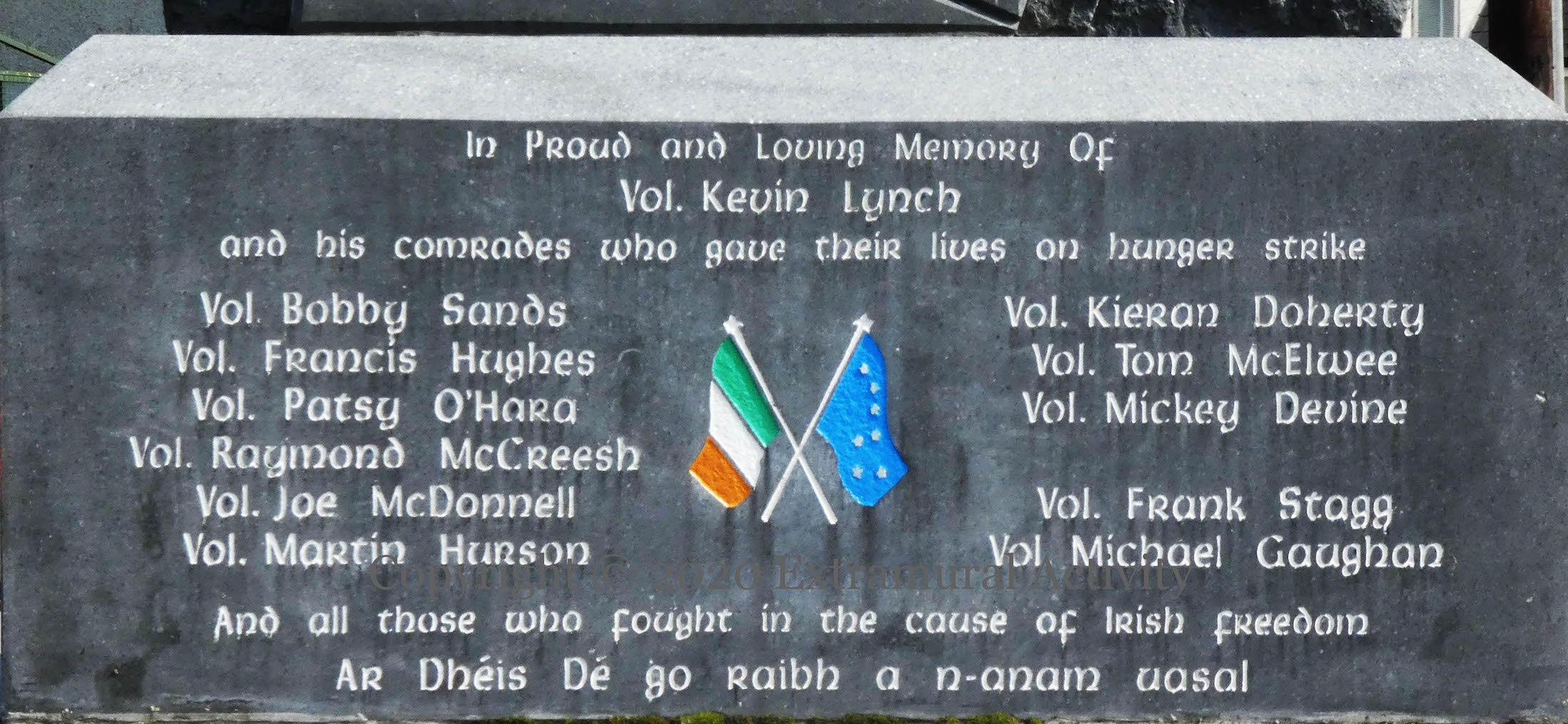 “I ndíl [ndıl] chuımhne ar Óglach Kevin Lynch a fuaır bás ar staılc ocraıs ar son saoırse, 1ú Lúnasa 1981 [who died on a hunger strike for freedom, 1st August 1981]. Erected by the Irish Republican Socialist Ex-Prisoners Memorial Committee.”