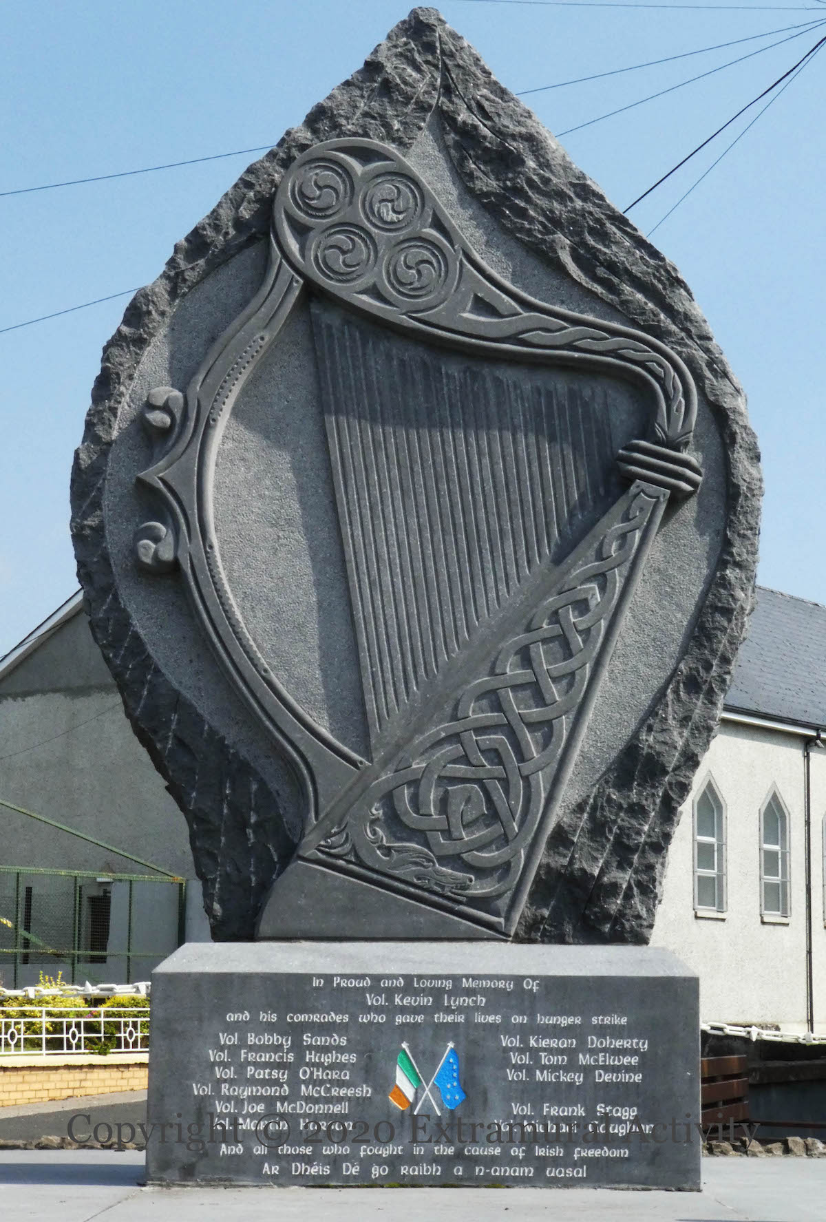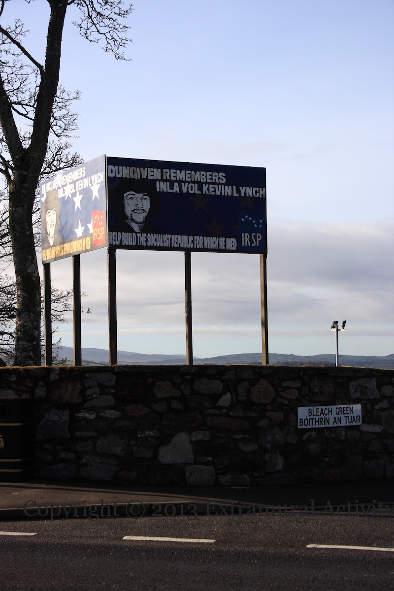 “The true revolutionary is guided by a great feeling of love. It is impossible to think of a genuine revolutionary lacking this quality” – Che Guevara Lynch. The INLA’s Kevin Lynch died in the second hunger strike after 71 days. He is buried in Dungiven, where this memorial sits on the main road between Derry and Maghera.