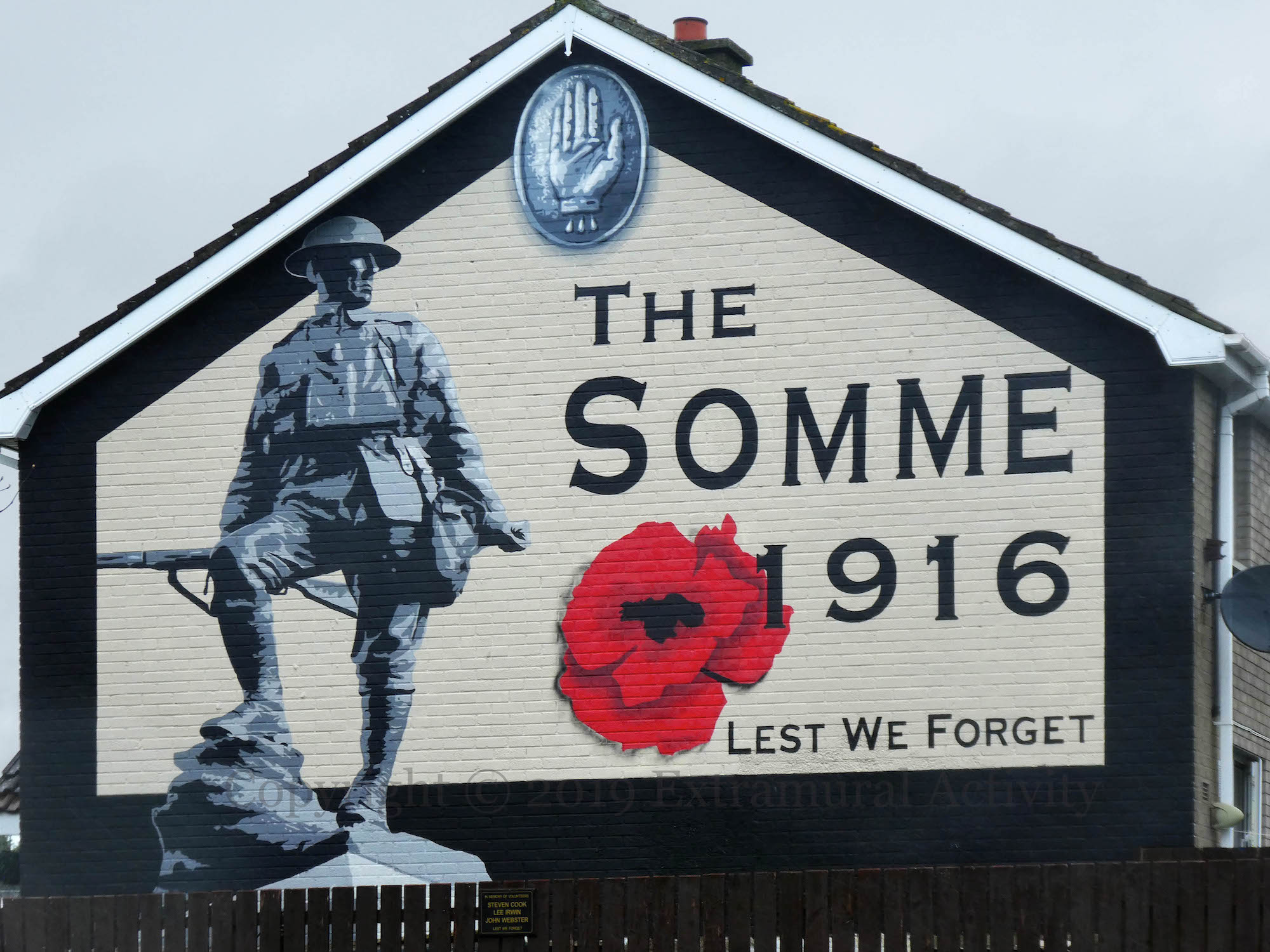 The ‘Liverpool No. 4 battalion’ UVF mural in Tynan Drive, Monkstown, (seen previously) has been replaced by a Dee Craig (Fb) mural to the soldiers of the Ulster Volunteers (see the ‘bleeding hand’ symbol in the apex) at the Somme. The small plaque on the fence to John Webster (a.k.a. Webber), Lee Irwin & Steven Cook, remains.