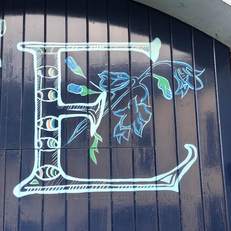 The “F” makes reference to the local “Irish (Peasant) Home Industries“, while the “E” shows the harebell (bluebell) in flower. The “I” might be St Brigid as an oak or a reference to Princess Taisie/Taobhgheal of Rathlin.