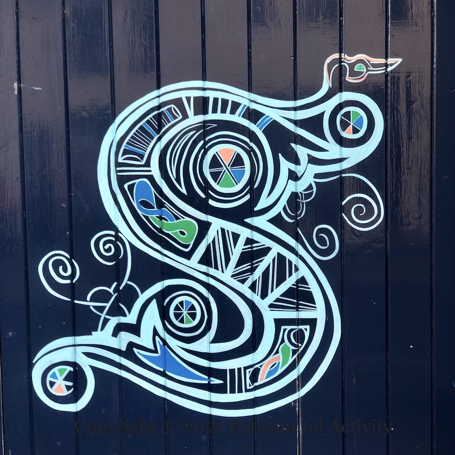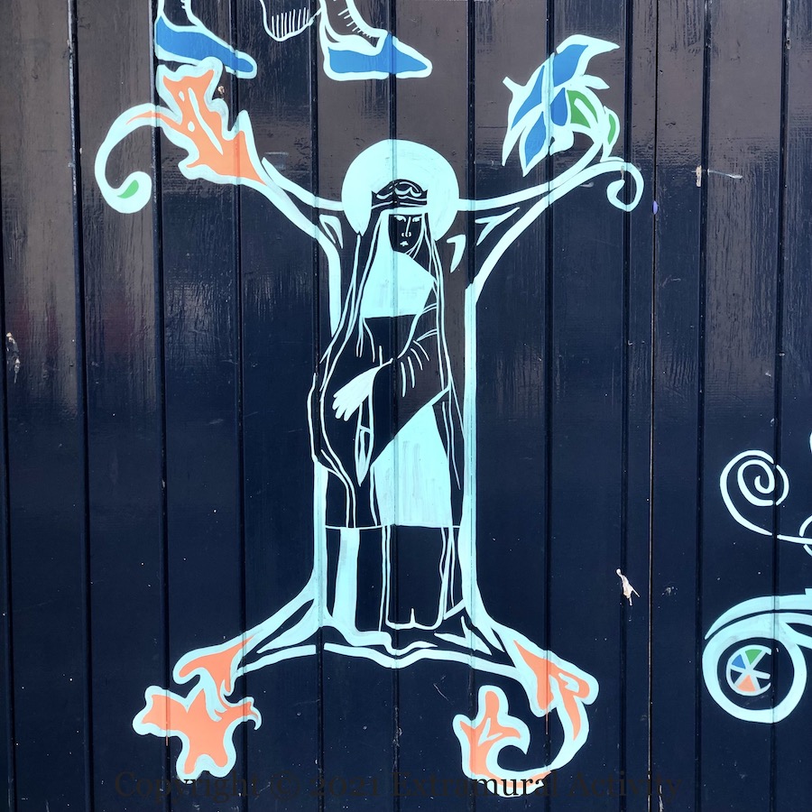 Glentaisie Drive – site of this mural by Friz (web) – is named for Glentaisie, the glen – one of the nine Glens Of Antrim, at the foot of which lies Ballycastle – and Glentaisie is named for Taise Taobhgheal (Taise the bright-cheeked), daughter of King Donn of Rathlin island, renowned for her beauty, and who lived in the glen with her husband Congal, who had to kill the Norwegian king Nabghdon to prevent her being carried off (Archaeology Ireland). Or so they say. She also inspired the name “Fair Head” for the local cliffs. Or so they say.