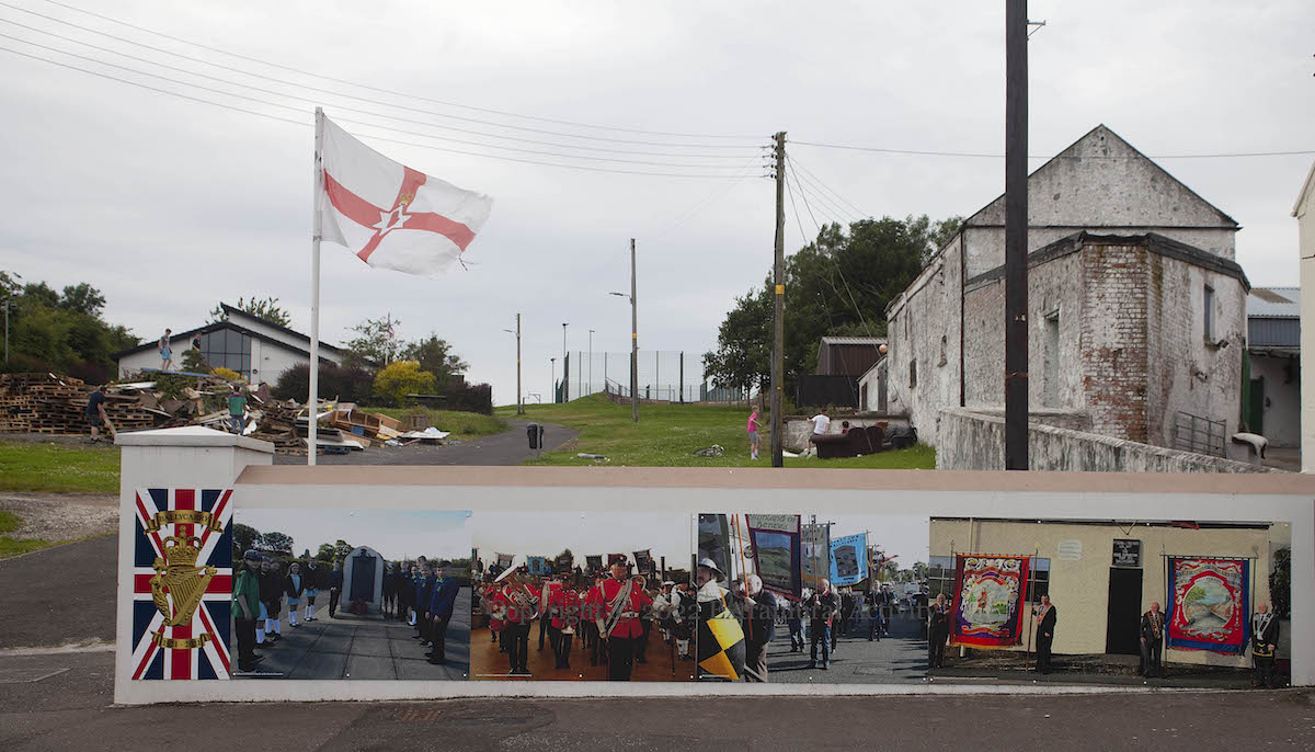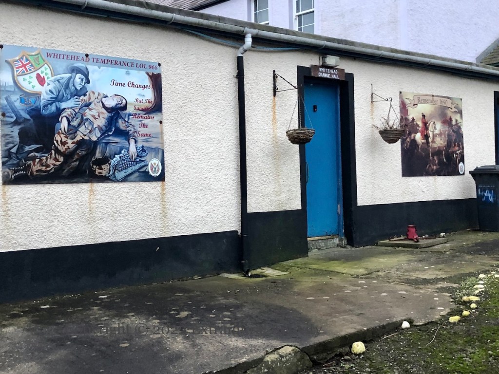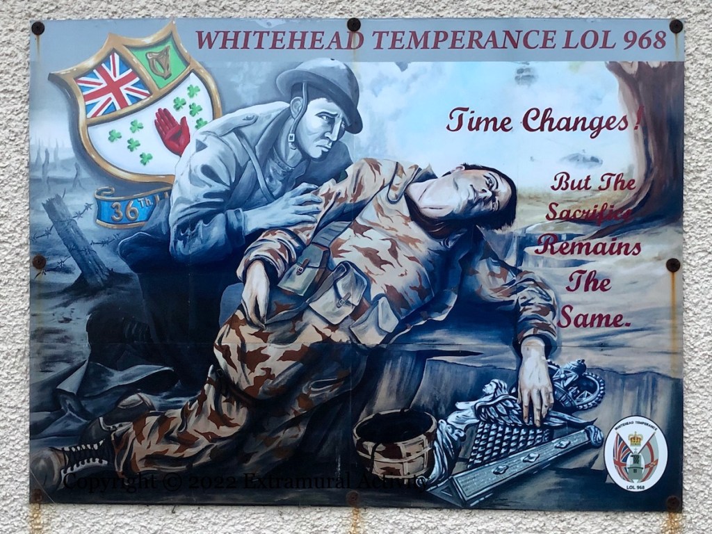 Benjamin West painted The Battle Of The Boyne in 1778 and his composition – with William moving from left to right on a white horse and Marshal Schomberg dying in the bottom-right corner – has become the standard representation in loyalist culture, perhaps due to versions of it appearing on the covers of songbooks for the Orange Order and the Apprentice Boys soon after (Belinda Loftus 1982 Images In Conflict). It appears here on the wall of Whitehead Orange Hall, along with a board connecting service by Irish soldiers in British forces in WWI and Afghanistan (see previously: Time Changes in east Belfast).
