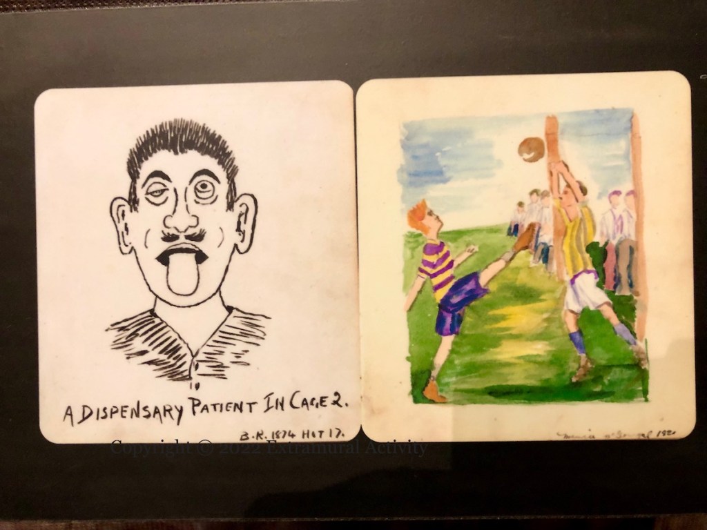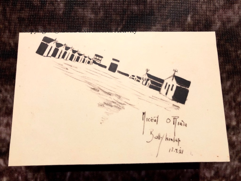 Ballykinlar barracks in County Down was originally Abercorn barracks, used by the British to intern IRA prisoners during the War Of Independence, and the use continued under the new Northern Irish government (WP); the camp held about 2,000 prisoners (McGuffin, ch. 5). The prisoners attempted to maintain their military structure and perform drills; they created a currency using cardboard discs (images can be seen at Old Currency Exchange) – and, as a way to keep up morale, worked on “autograph books” in which prisoners would write dedications and verses for one another and occasionally draw pictures. The pages shown here are from books currently exhibited in Monaghan County Museum; Offaly Archives has digitised an autograph book; a few more images from a book in the Kilmainham collection can be seen at the BBC.