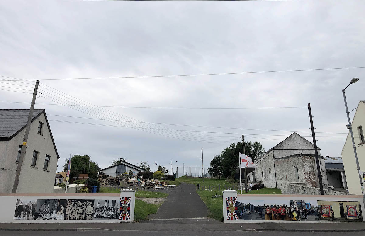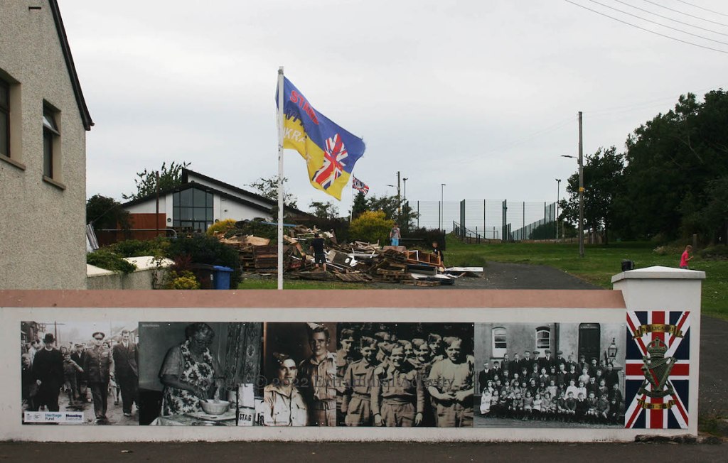 A ‘Stand With Ukraine’ flag and Ulster Banner fly above the walls; a bonfire is being hastily erected in the background.