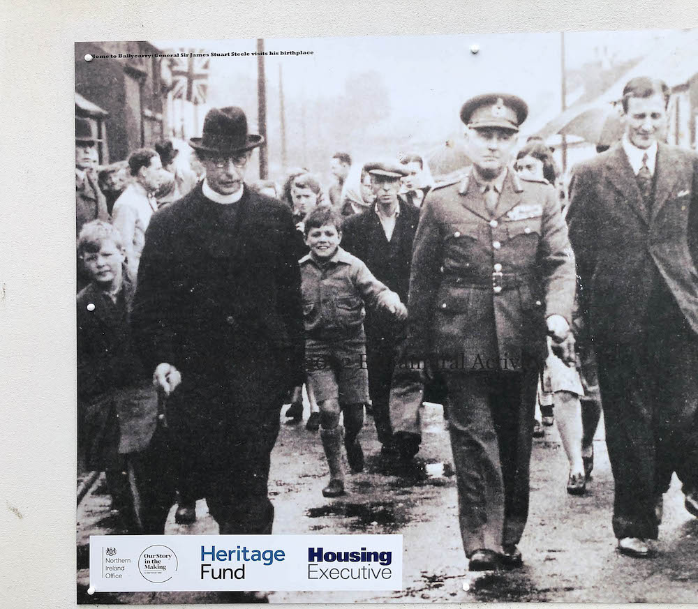 Our Story In The Making – NI Beyond 100 is a NI Office programme collecting stories showcasing Northern Ireland “on the world stage”. It has lent its brand to the Ballycarry centenary boards shown in today’s post, which have black-and-white photographs on the left (beginning with “Home to Ballycarry – General Sir James Stuart Steele visits his birthplace”) and colour photographs on the right (beginning with children visiting the Steele monument).