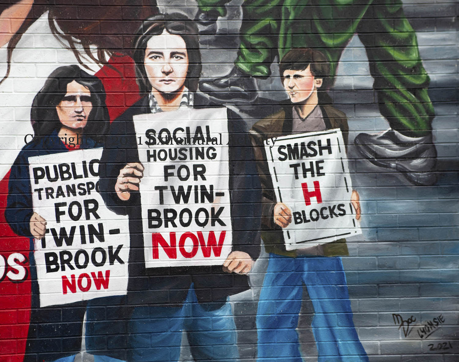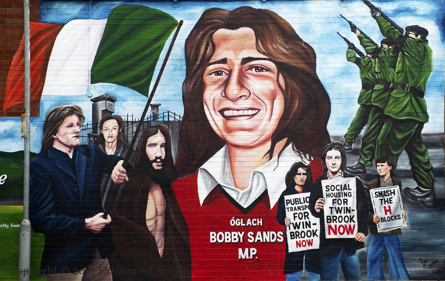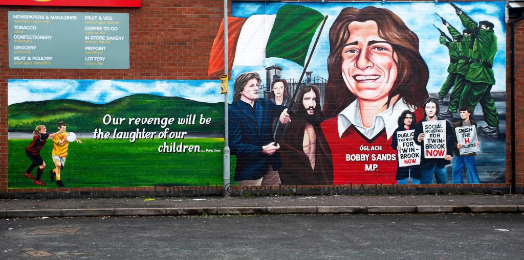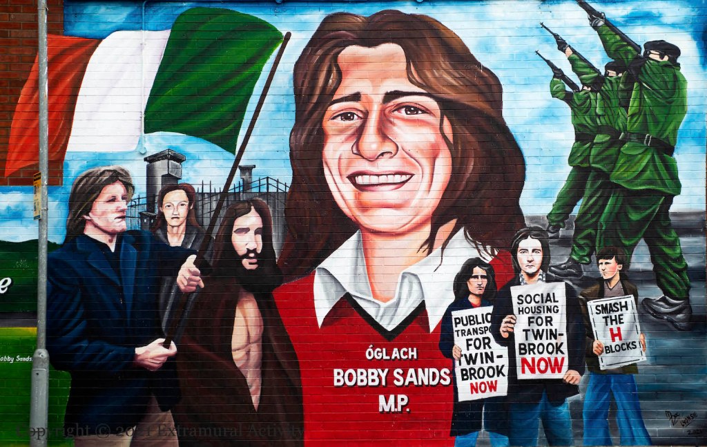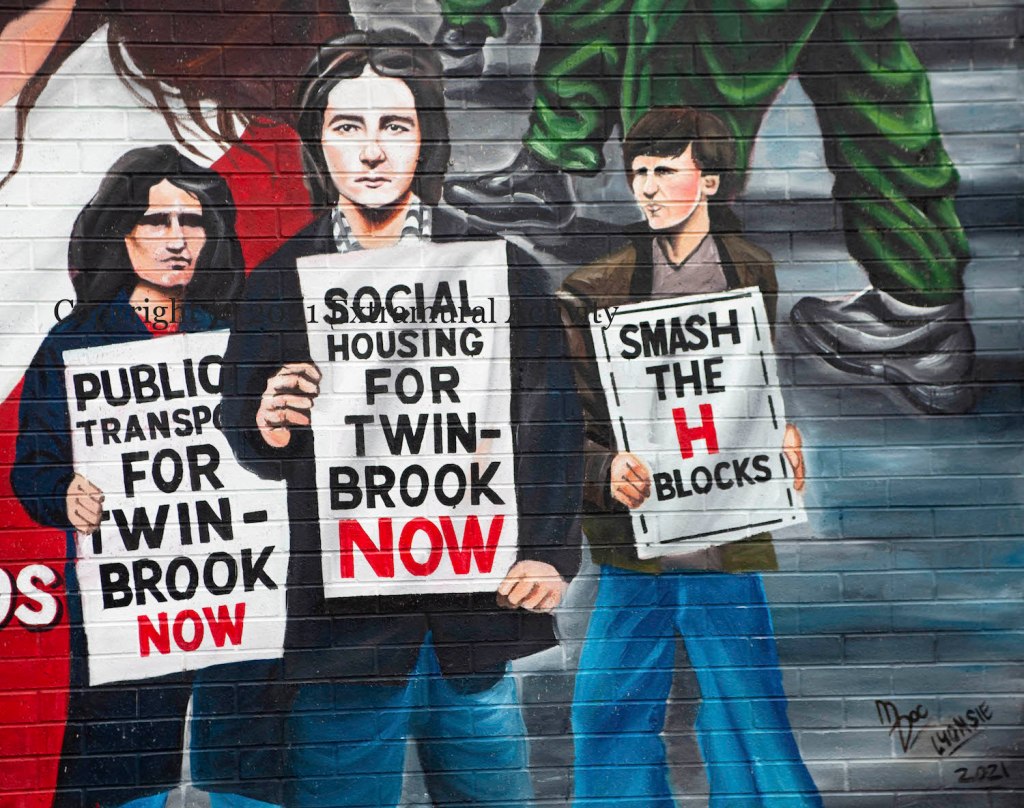 In 2019, images of Bobby Sands before his (second and final) arrest and imprisonment were rediscovered in the collection of French photographer Gérard Harlay. Sands was serving as a flag-bearer in an August 1976 march from the Busy Bee to Dunville Park to protest the withdrawal of political status. (For some of Harlay’s images, see Bobby Sands Trust.) This new mural in his home area of Twinbrook copies one of the images (though presents him as carrying a Tricolour rather than a harp) along with protesters protesting for “Public transport for Twinbrook now” and “Social housing for Twinbrook now”.