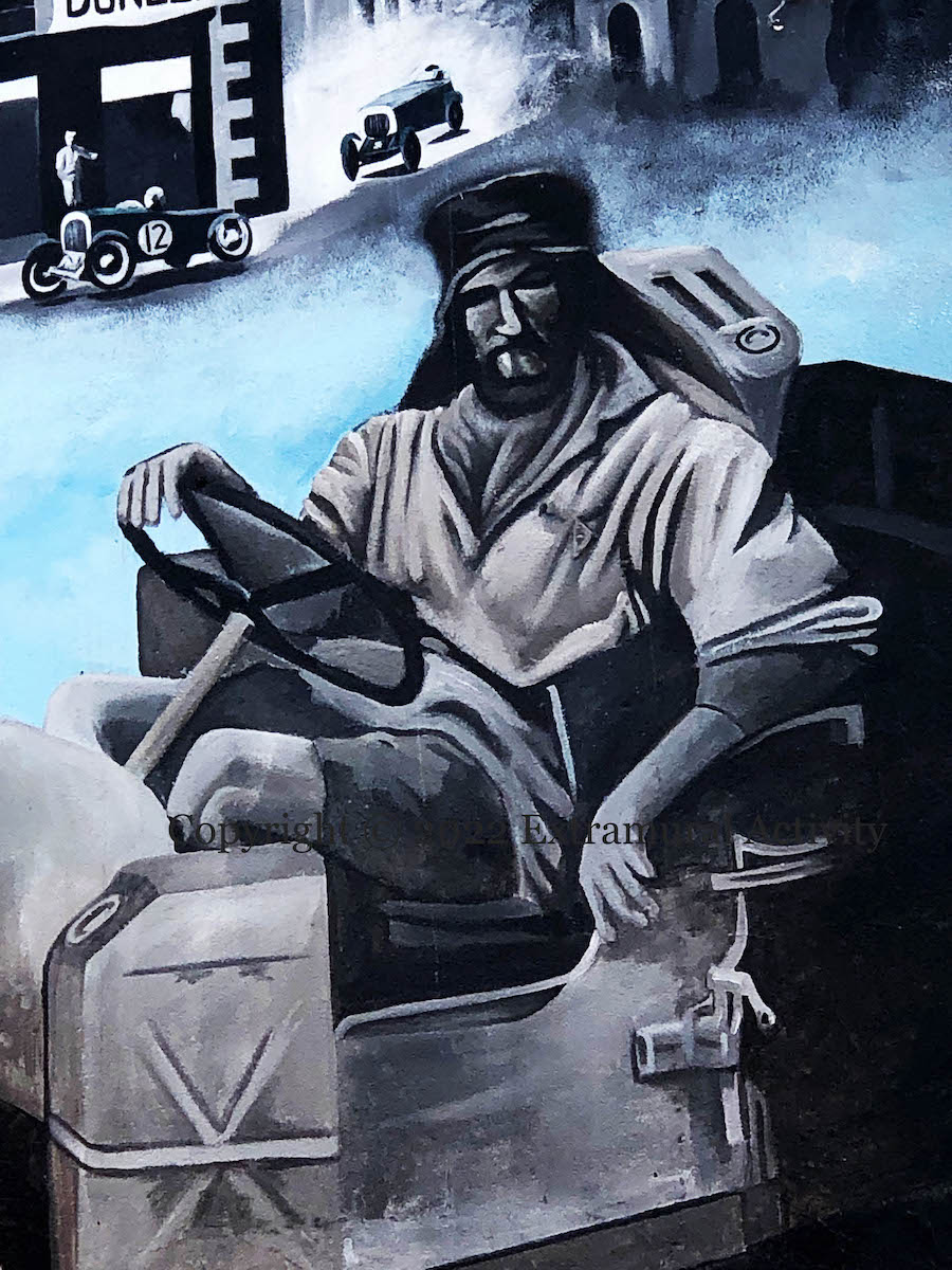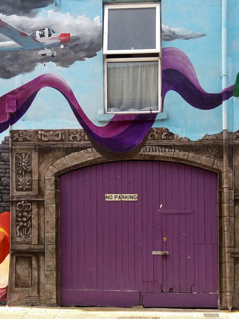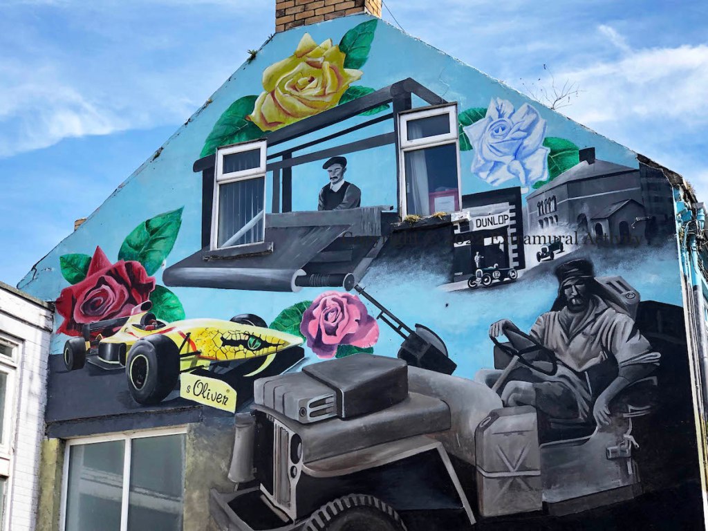 There are two main parts, in High Street and in Lower Mary Street. In High Street, we see Blair “Paddy” Mayne; the Jordan ‘Hissing Sid’ Formula 1 race-car (Eddie Irvine, who is from Newtownards, drove for Jordan until 1996); a weaver working a loom (the image is from Waringstown, but is perhaps meant to represent local mills such as Walker’s or Ards & Webb); an image of the Ards TT.