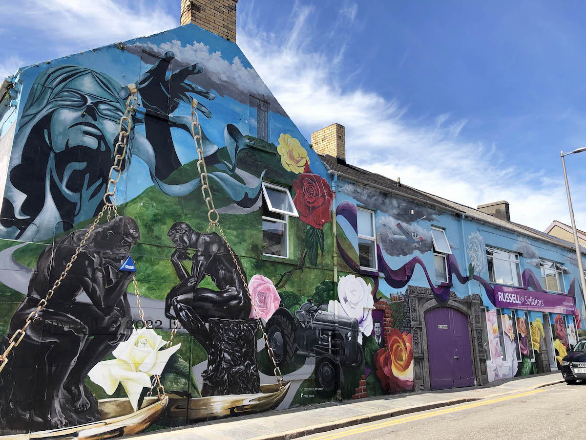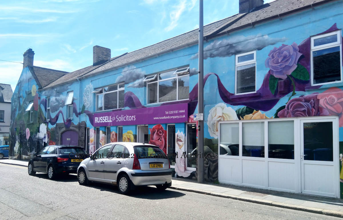 The giant mural around the offices of Russell & Co solicitors in Newtownards combines legal imagery with famous north Down sites and people.