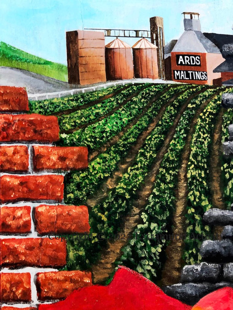 In Lower Mary Street, from behind Scrabo Hill, Lady Justice weighs scales each containing Rodin’s statue The Thinker. We also see a modern agricultural tractor, as designed by Harry Ferguson; a portrait of James Russell who founded the solicitors’ firm in 1948; a Cessna light aircraft, presumably at Newtownarrds airport, the first purpose-built airport on the island (Ulster Flying Club); the former Ards Maltings; a sack of Comber Earlies.