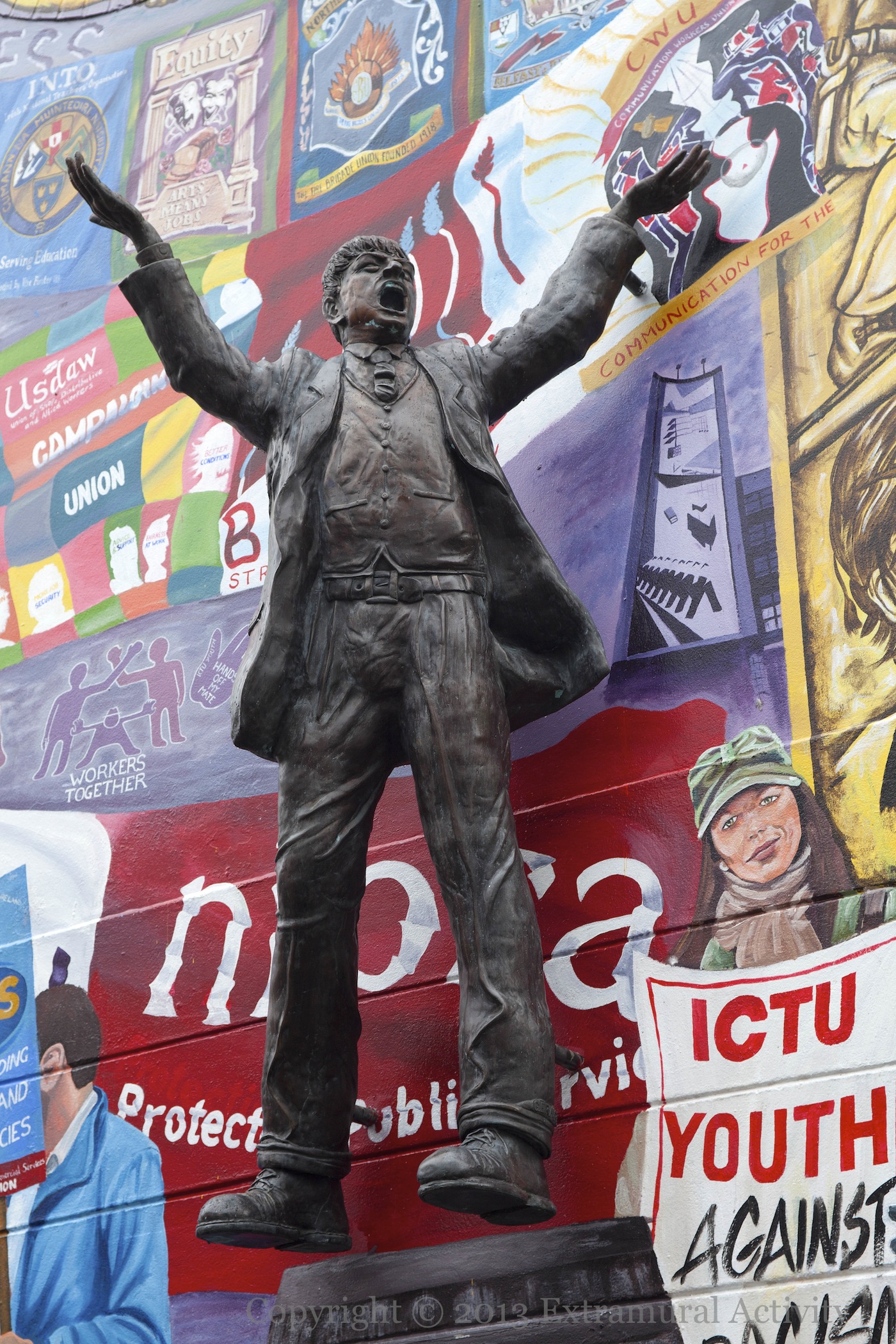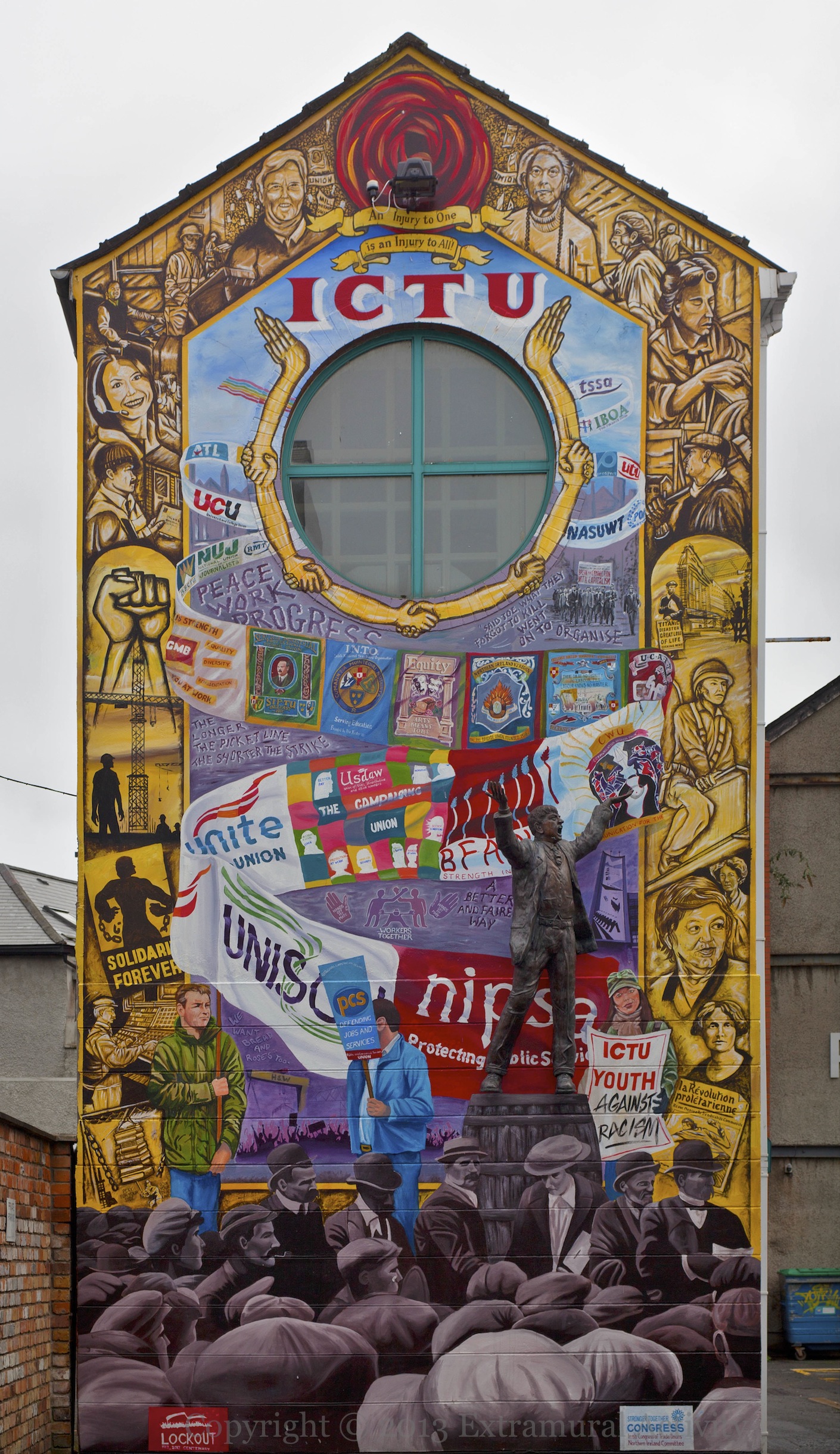 “There can be no dignity in labour, till labour knows no master.” The statue of Jim Larkin in Donegall Street Place has been augmented with a massive mural celebrating the many unions which have membership in Ireland. 2013 marks the 100-year anniversary of the Dublin lock-out, which ran from August 1913 to January 1914. The images below show a close-up of the statue (which was previously featured sporting a placard), three female figures in the border to the right of Larkin (Winifred Carney, Inez McCormack, and Betty Sinclair?) and finally, the plans for the piece, which were hanging on the left-hand wall prior to completion.