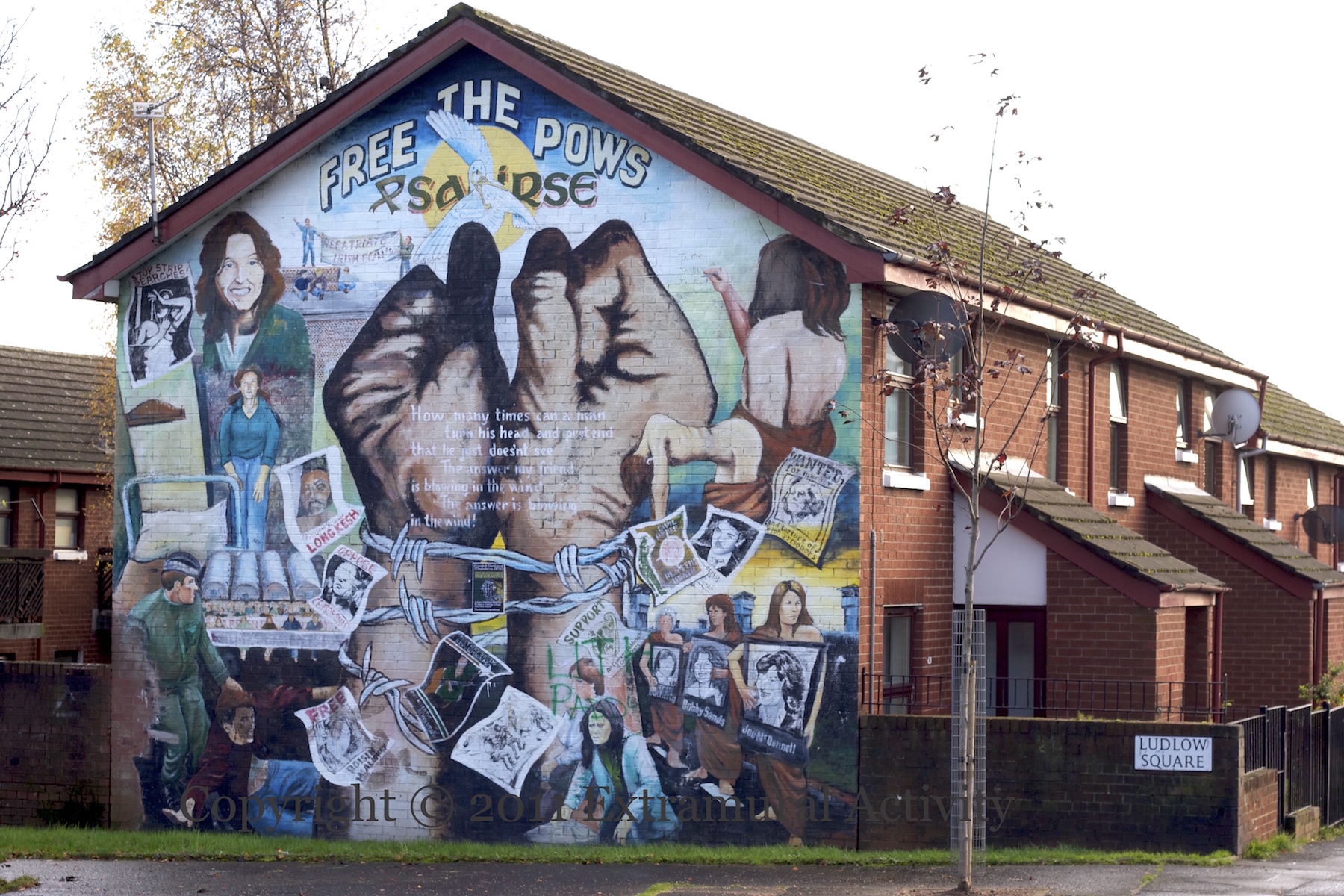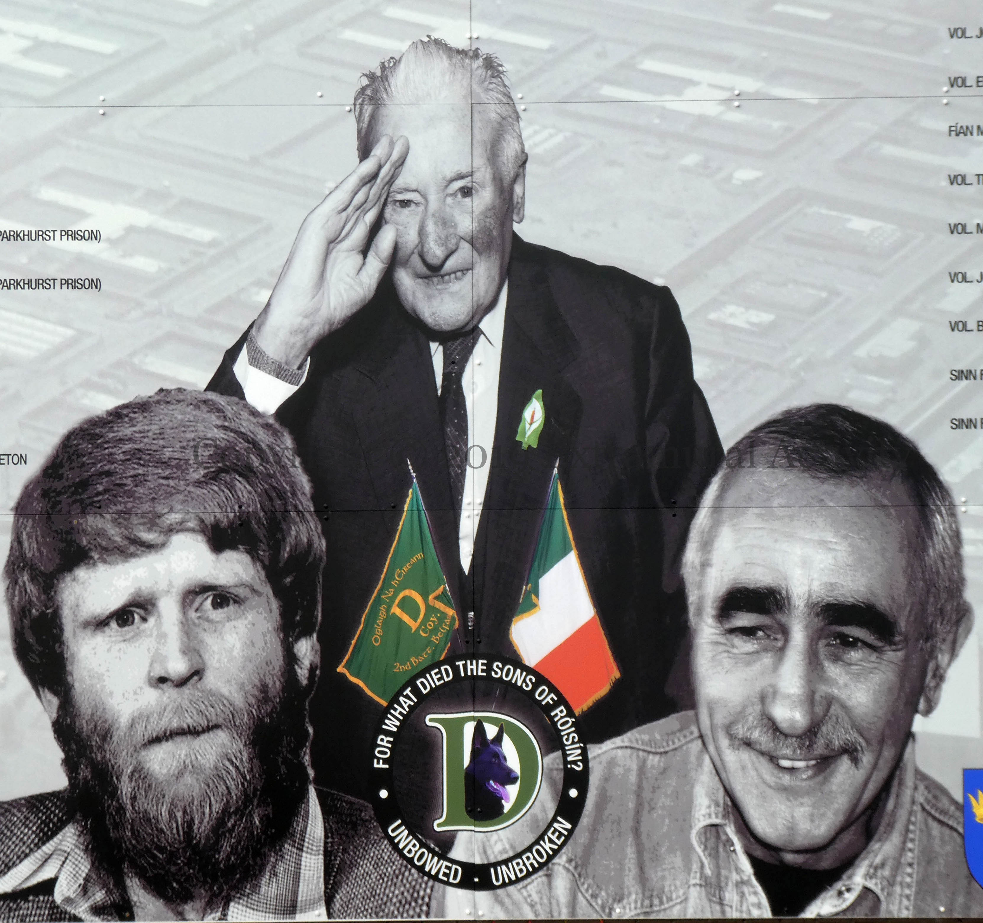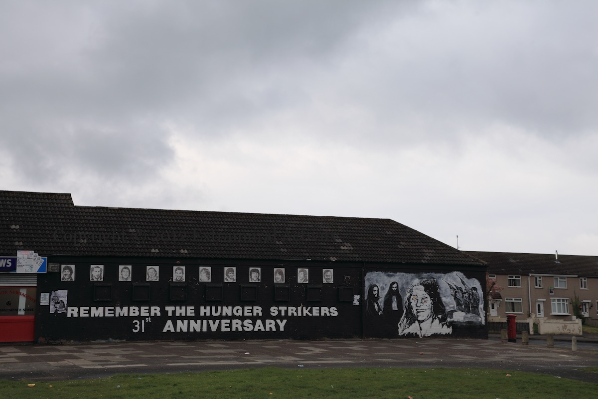 “Óglach Bobby Sands 9th March 1954 – 5th May 1981”. Sands was the first of the ten IRA and INLA prisoners to die in the second hunger strike. For the 44th anniversary of his death, a statue was unveiled in Twinbrook, near the Sands family home and next to the memorial garden in Gardenmore Road (Peter Moloney Collection).