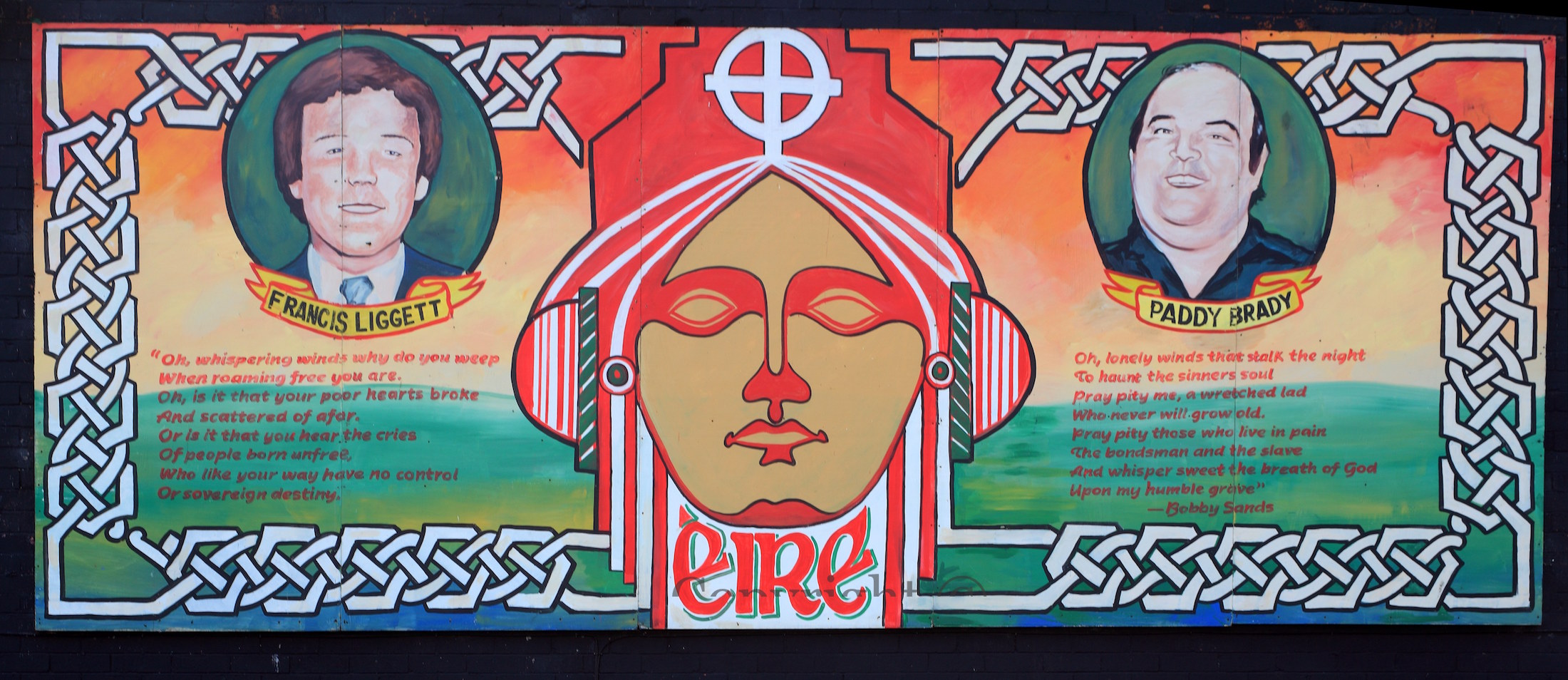 Here are three republican boards, framed – Belfast Brigade ONH, Cogús (POWs), 1981 hunger strikers – encouraging New Lodge residents to “Join the Republican Network For Uni[ty]” (web), above a Bobby Sands quote: “We all know the reason that we are being tortured – because we are political dissidents, POWs, and we won’t bend the knee or conform” (from Thoughts From The Shadows).