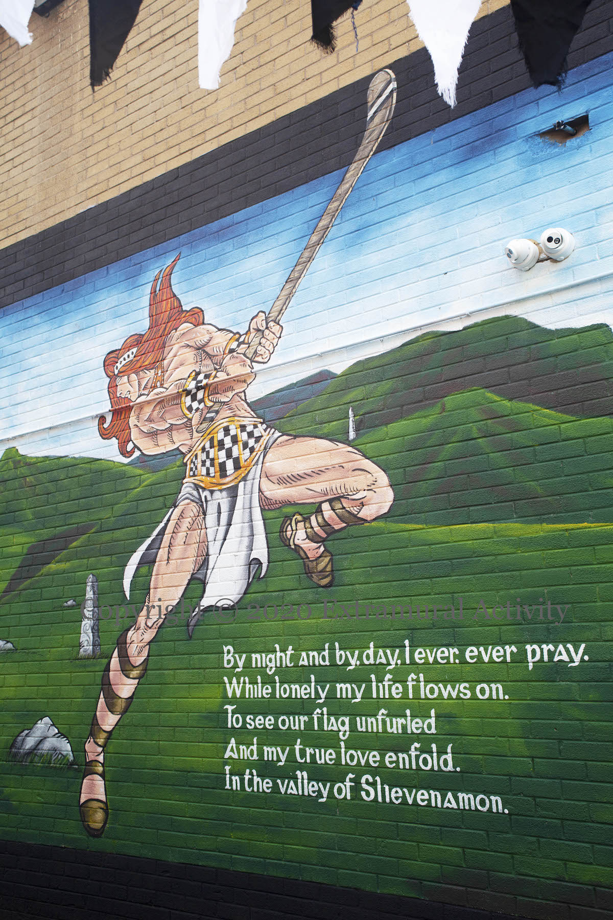 In the left-hand painting – the CNR piece, by Marty Lyons and a Short Strand artist – Francis Hughes of the IRA – in what we think is a unique break with tradition – takes the place of Cú Chulaınn, who became a symbol of the 1916 Easter Rising when Oliver Sheppard’s statue of Cú Chulaınn’s death was placed in the re-built GPO. Hughes has a tourniquet on his right leg, an assault rifle dangling from his wrist, and instead of the raven that signified Cú Chulaınn’s death there is the symbol of republican political prisoner, the lark, which appears in the apex of many other republican murals.