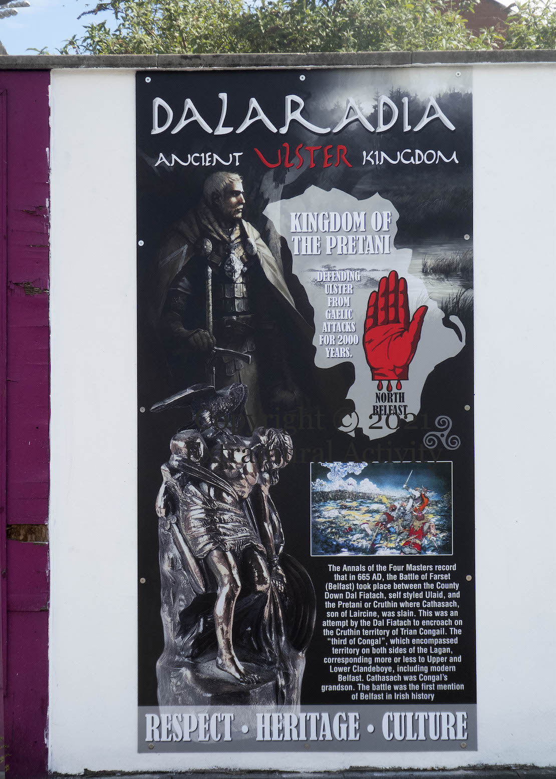 The battle scene shown is Jim Fitzpatrick’s vision of the battle of Moira (in 637), rather than “Bellum Fertsi”. The salience of this description of intra-Ulster fighting is that there is a contention that the Cruthin were Scots (Picts) thus allowing for the idea (employed especially by the UDA – see Ulster’s Defenders and Defender Of Ulster From Irish Attacks) that present-day northern Protestants have a heritage, and a history of fighting for what is roughly Co. Antrim, that pre-dates the plantations. For more information and a similar board, featuring the tower blocks of Rathcoole rather than Cuchulainn and the Battle of Moira, see Kingdom Of The Pretani. For the debate over a connection to the Picts, see WP.