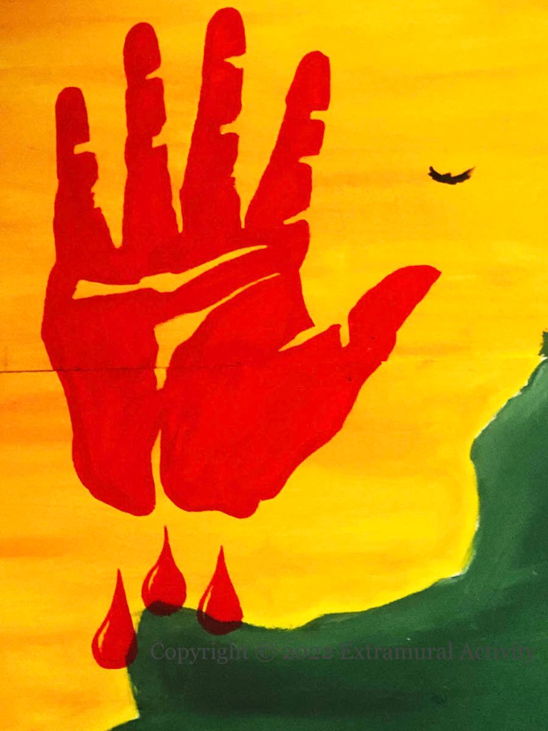 In the second of the pieces – the PUL piece, painted by Dee Craig – the raven sits on the shoulder of a Cú Chulainn who has a red cloak and carries a Northern Ireland shield. “Down through the years, his shadow has cast a new breed of Ulster defender”: a (loyalist) hooded gunman. Thus while Cú Chulaınn is the (surprising) “Ancient defender of Ulster!”, the UVF and UDA are its modern defenders, now that the B Specials and UDR are gone.