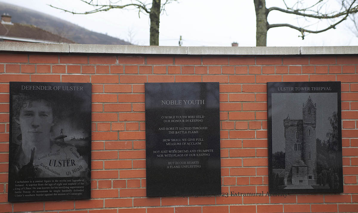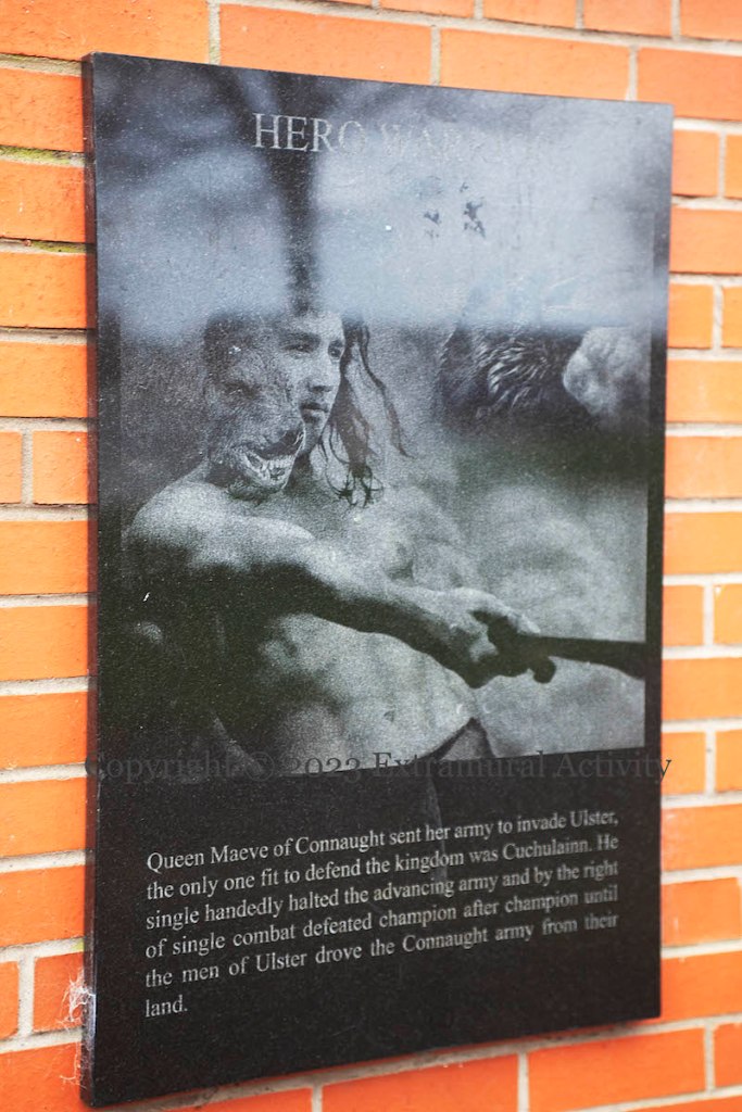 The biographical panels focus on Cú Chulaınn’s age – the sixth panel emphasises that Cú Chulaınn was only 17 when he held off Maeve’s forces – which is perhaps a similarity with those who joined the 36th Division, but how the “defender of Ulster” is connected to the defense of Europe is obscure.