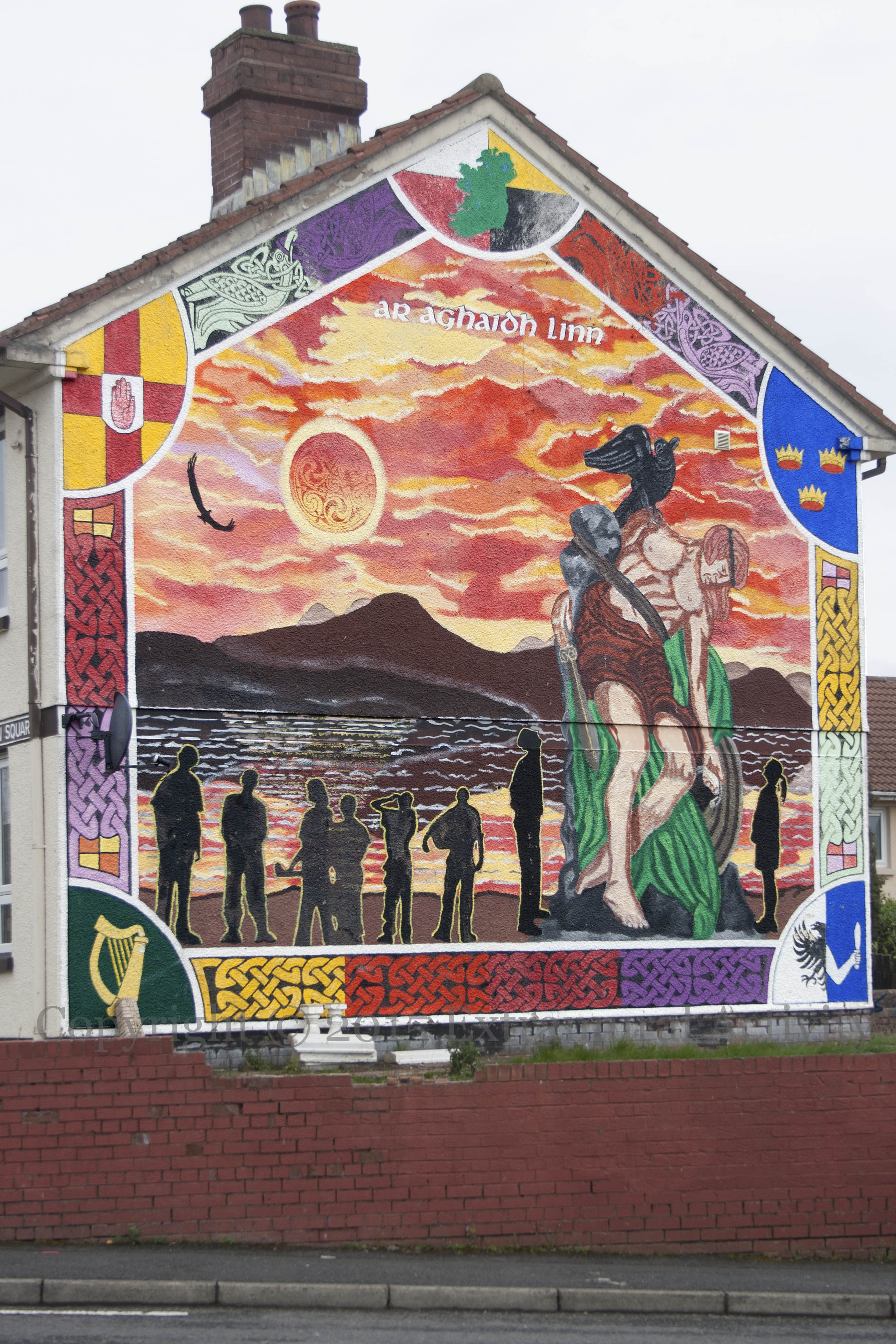 “Ar aghaıdh linn [Onward]” Silhouetted figures, one carrying a hurley, take inspiration from a dying Cú Chulaınn and gaze across a body of water, perhaps Carlingford Lough towards the mountains of Mourne – Cú Chulaınn’s traditional place of death is in County Louth, outside Dundalk. Tuan the hawk historian, who has seen all of the conquests of Ireland, flies overhead.