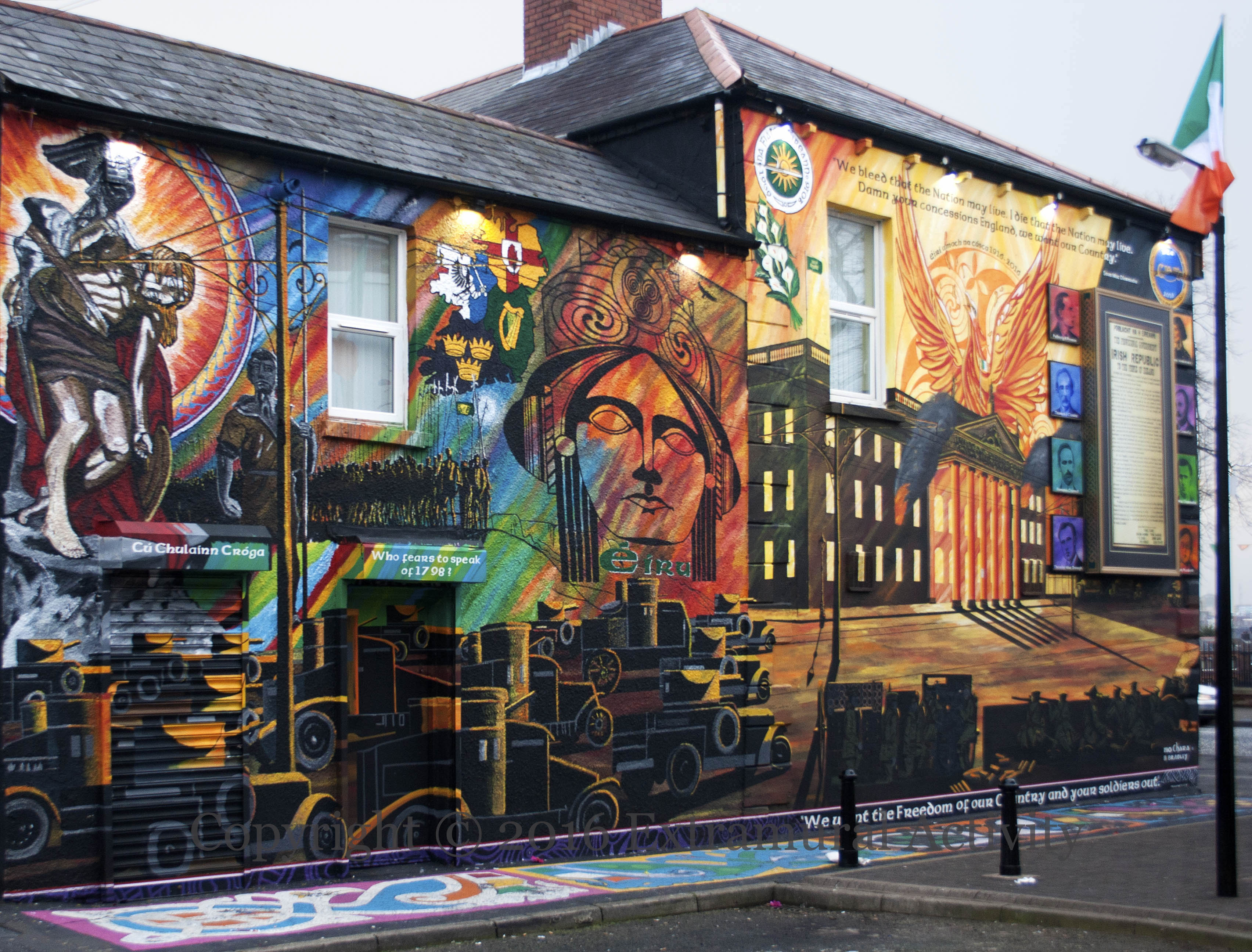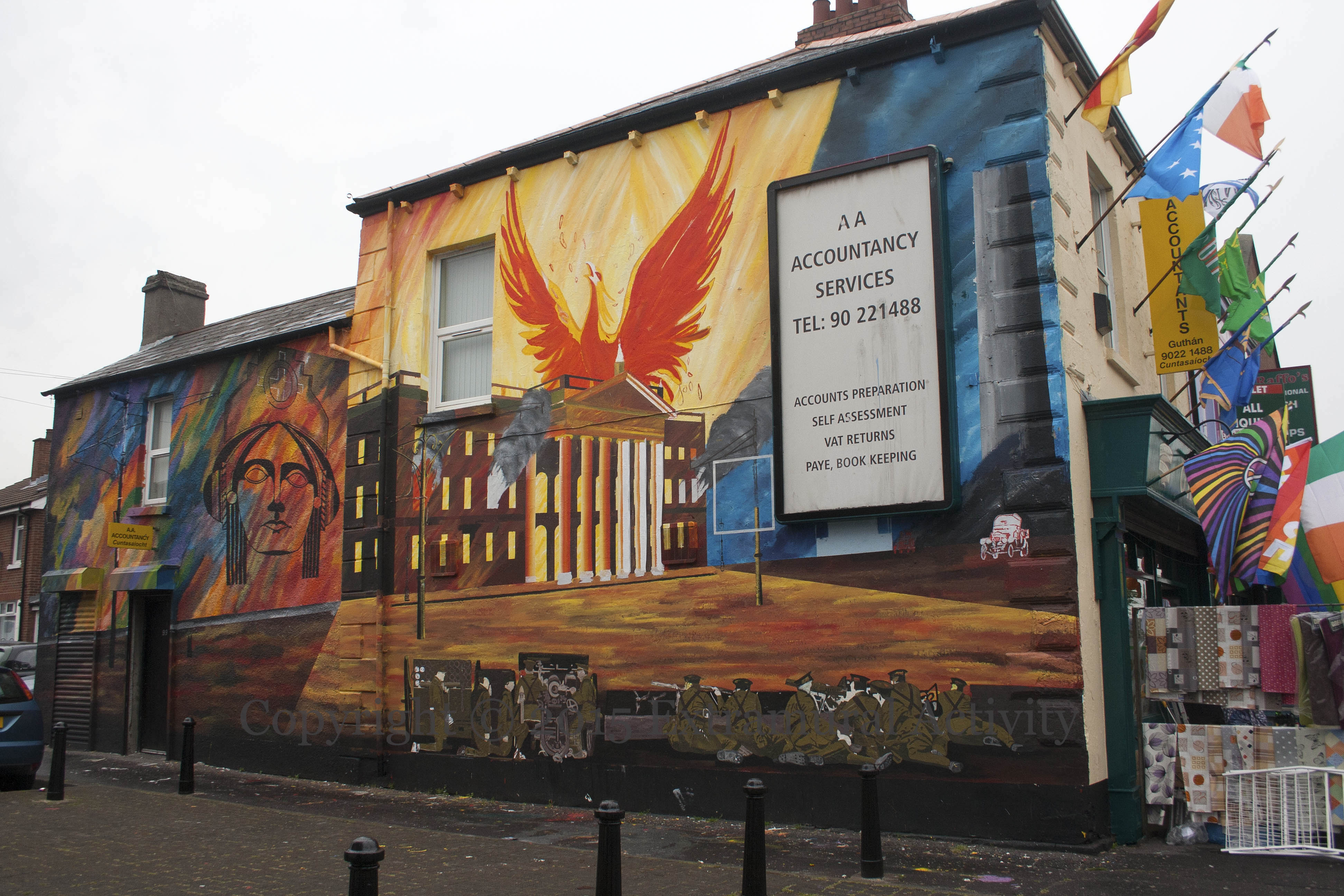 Arrayed against the forces of the British Army (which are shown in armoured cars and in sniping positions in the foreground of the mural, along the whole length of the wall) are various symbols of Irish nationalism: Oliver Sheppard‘s 1911 statue of Cú Chulaınn dying; the pikemen of the 1798 Rebellion (featured yesterday: Éırí Amach 1798); the four provinces of Ireland; Érıu the mythological queen of Ireland/Éıre as designed by Richard J King/Rísteard Ó Cíonga; Easter lilies; the emblems of Na Fıanna Évreann and Cumann Na mBan on either side of a quote from (The Mainspring) Sean MacDiarmada “We bleed that the nation may live; I die that the nation may live. Damn your concessions, England: we want our country”; a phoenix rising from the flames of the burning Dublin GPO (inspired by Norman Teeling’s 1998 painting The GPO Burns In Dublin); the GPO flying an ‘Irish Republic’ flag; portraits of signatories and other rebels — (left) Padraig H. Pearse, Thomas J Clarke, Eamonn Ceannt, Thomas MacDonagh, (right) Countess Markievicz, James Connolly, Sean MacDiarmada, Thomas Plunkett; the declaration of independence, placed over the advertising box of AA Accountants – see the in-progress shot below. For more work-in-progess images, see yesterday’s post, Éırí Amach 1798. At the very bottom is a quote from the mother of Gerard ‘Mo Chara’ Kelly, Harriet Kelly: “We want the freedom of our country and your soldiers out.”