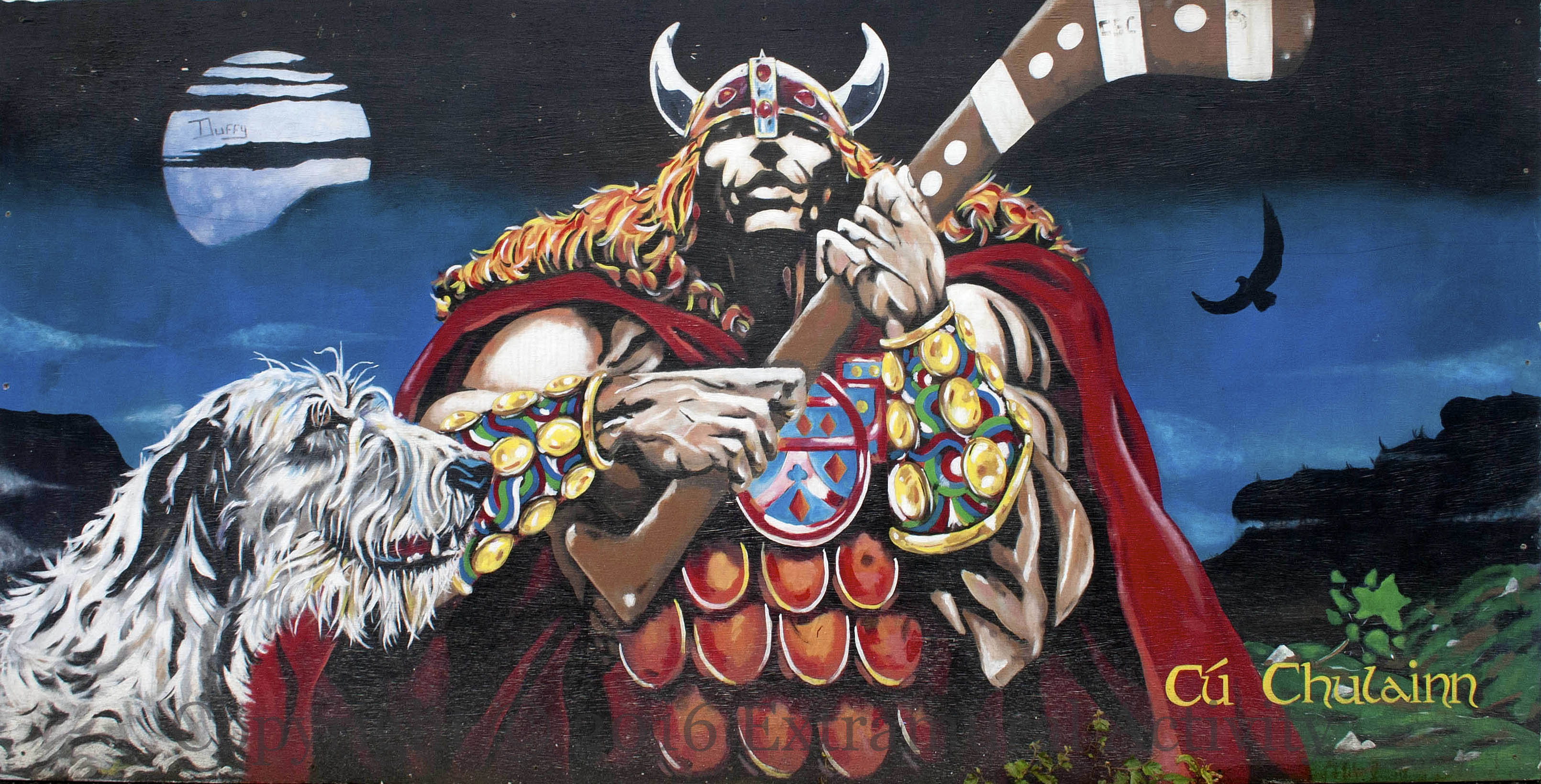 “Cú Chulaınn” is Irish for “Culann’s Hound” after the boy Setanta killed the smith’s hound and promised to take its place until another one was raised. In one version of the legend, Setanta kills the original hound by driving a slıotar (hurley ball) down its throat – hence the hero is shown here holding a camán (hurley stick) rather than a sword. In the original picture on which this mural is based, the hero is not Cú Chulaınn but Jim Fitzpatrick’s vision of Nuada Silverarm and he carries a sword.