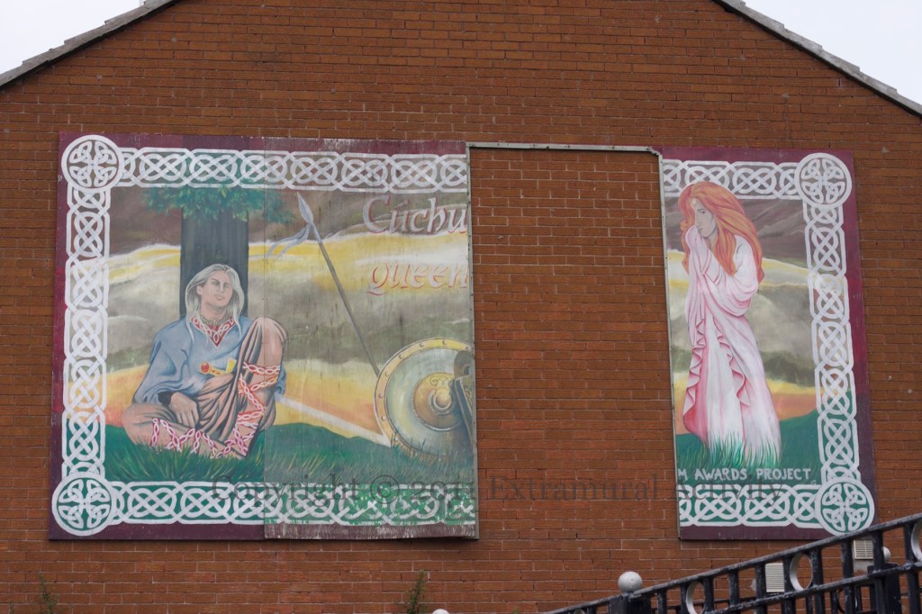 A seven-year old Setanta become Cú Chulaınn (Culann’s Hound) after killing the beast by driving a sliotar (the ball used in hurling) down its throat. Detail from a mural in Roumania Rise, off Ross Road. Wide shot of the whole below. The lettering reads “Mol na nóıge agus tıocfaıdh sí [sic]” [as written: praise the young and it [sic] will flourish; usually the phrase is “Mol an óıge …” “praise youth …”]