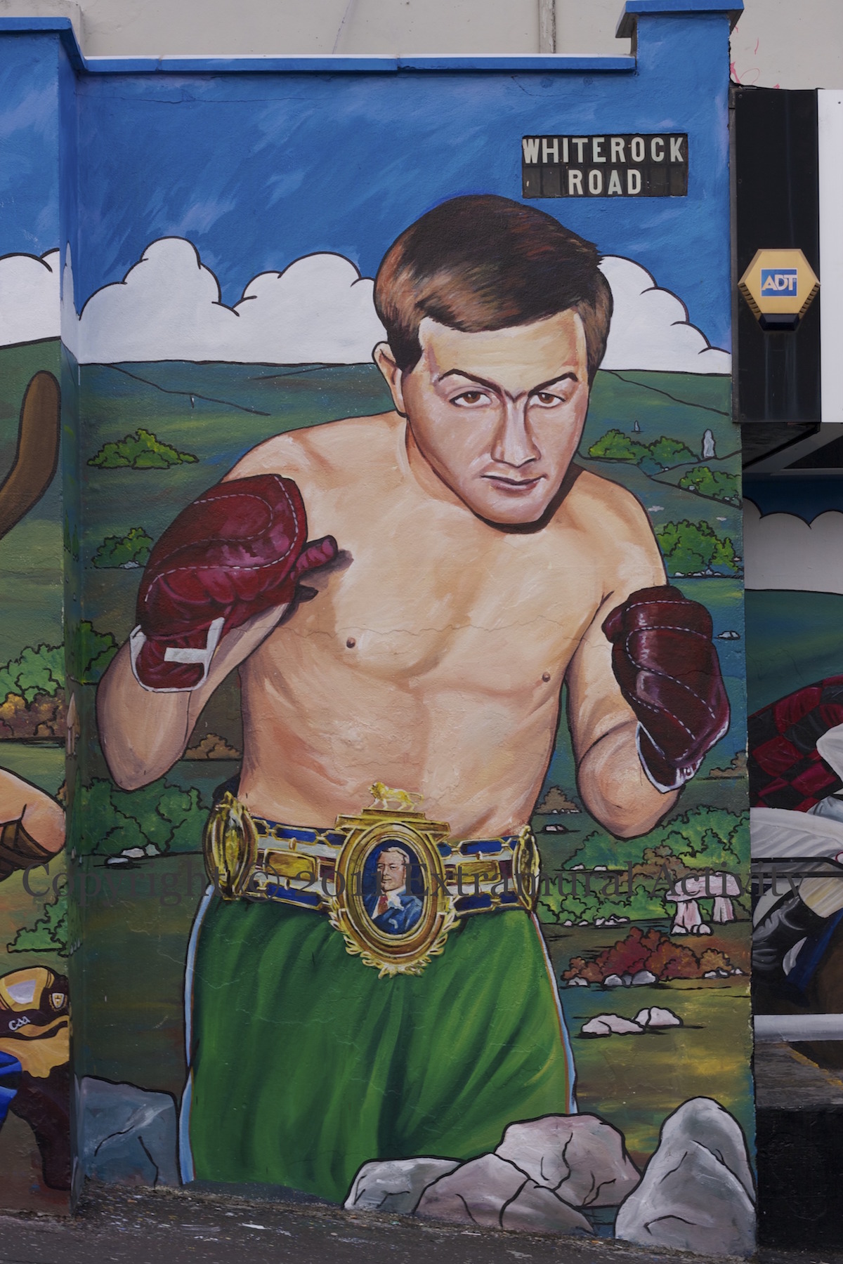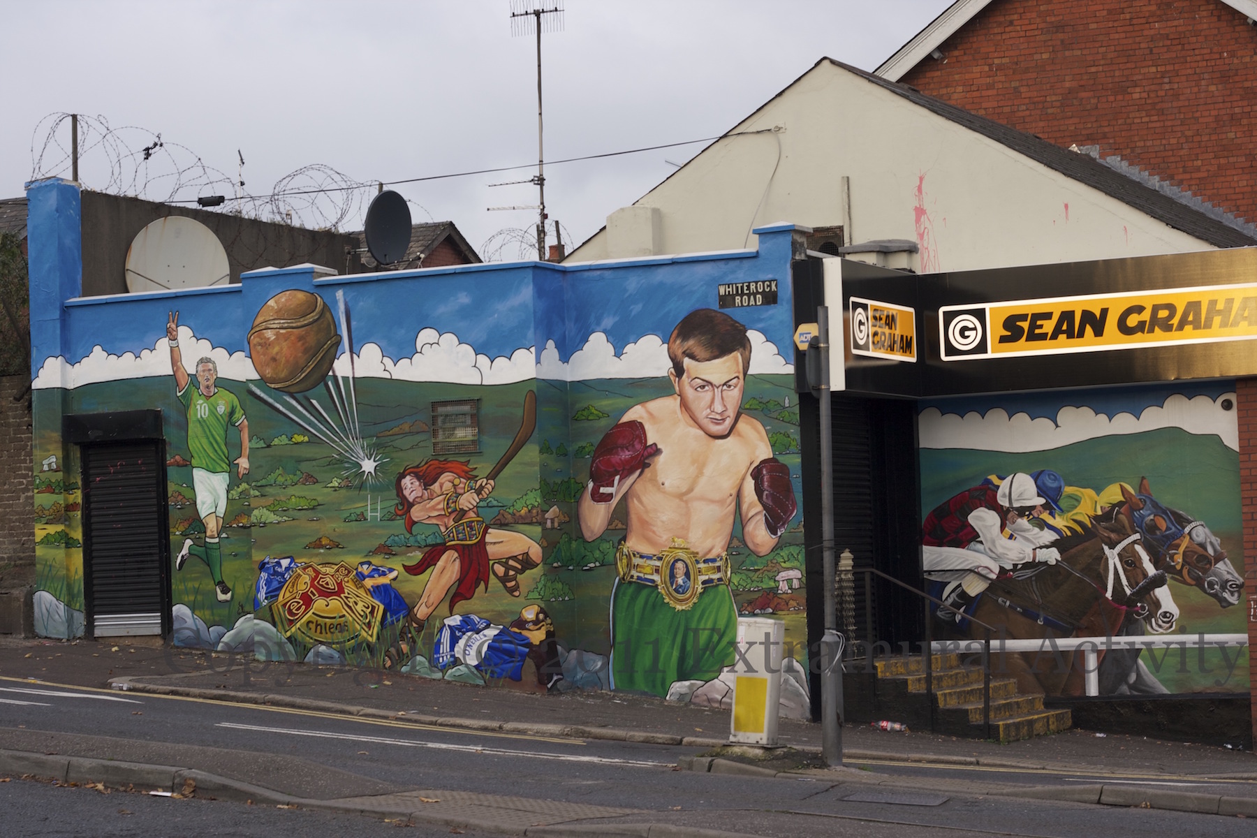 Sporting mural on the side of Sean Graham’s bookmakers. Ireland’s leading goal-scorer Robbie Keane is on the left. Cú Chulaınn plays hurling in the centre. (See also the mural on Casement Park M05144.) The boxer on the right is John Caldwell, a champion from the 1950s and 1960s from Cyprus Street (WP). Painted by a Short Strand artist at the junction of Whiterock and Falls roads.