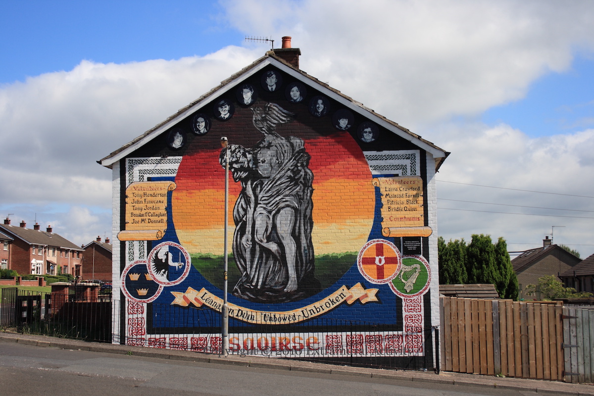 The main Lenadoon mural is refreshed and more portraits and a plaque added (on the right). The dying Cú Chulainn (as portrayed in bronze by Oliver Sheppard, in a statue installed in the GPO in 1935) is used as a symbol for the locals from Lenadoon (including IRA volunteers) who fought for freedom (“saoırse”). They are listed on the scrolls to each side and in the portraits in the apex: Tony Henderson, John Finucane, Brendan O’Callaghan, Joe McDonnell, Laura Crawford, Maıréad Farrell, Patricia Black, Bridie Quinn (previously listed as Bridie O’Neill).