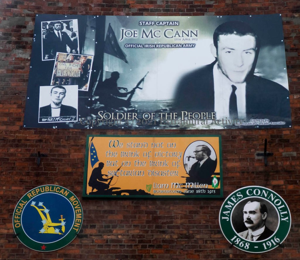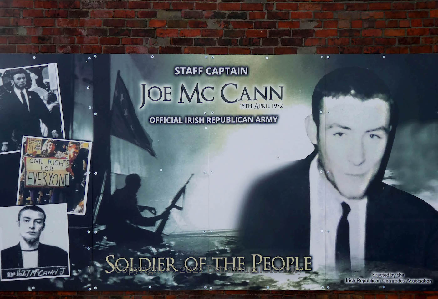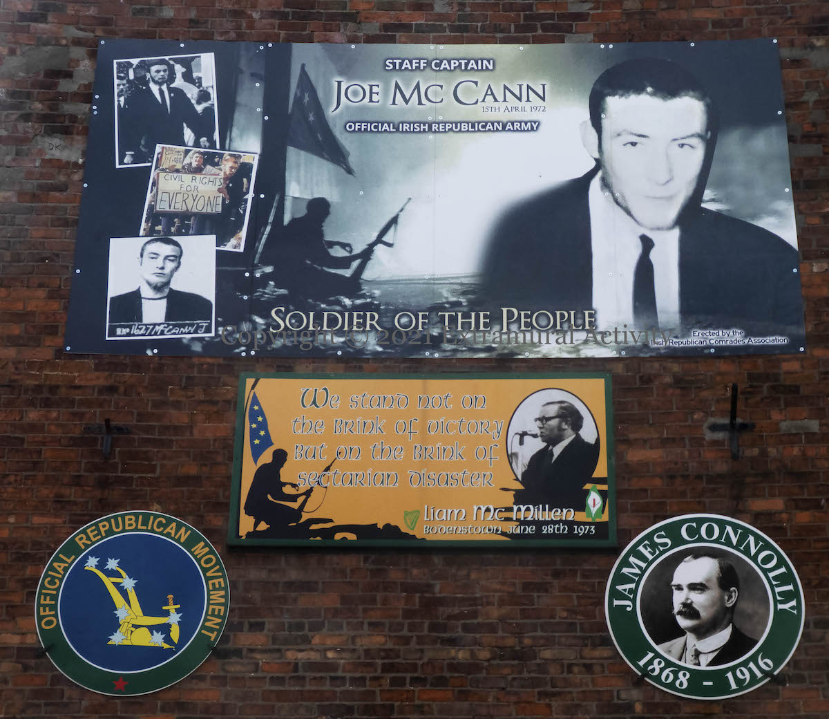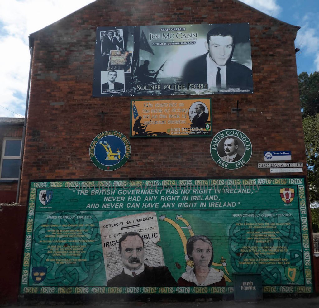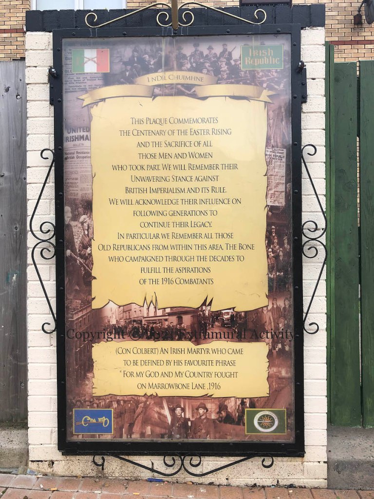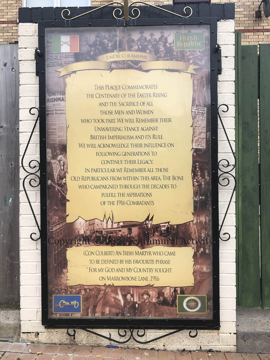 “The young and the old rallied around/To help fight the forces of the British crown/Unsung heroes too many to name/Defended Unity flats and never sought fame”. Unity flats were built in 1968 to replace the old Carrick Hill but immediately came under repeated attack by loyalists from the nearby Peter’s Hill and Shankill; by 1987 their demolition had been approved but because of difficulty in rehousing residents (Hansard), the new Carrick Hill was not completed until 2009 (BelTel). The flats have a Facebook page, Growing Up In Unity Flats. The plaques shown today are on the side of the newsagents in the new Carrick Hill.