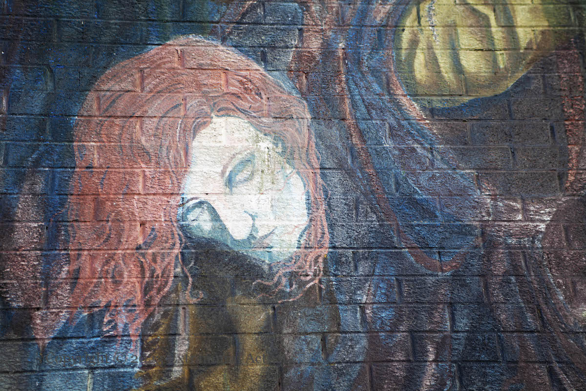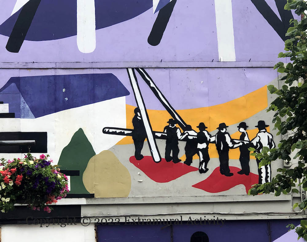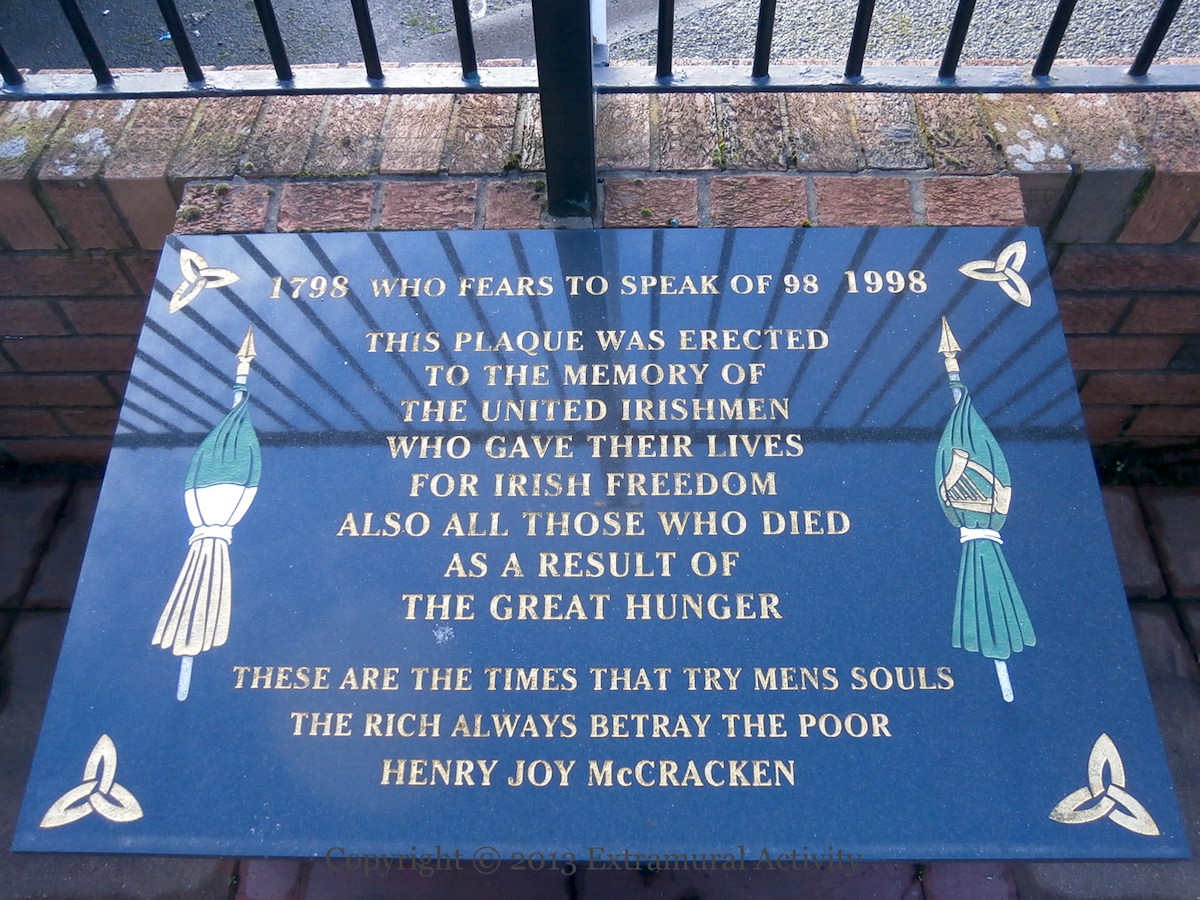 Painted by Andrea Redmond in South Link, Andersonstown, Belfast, for the 200th anniversary of the rebellion. Also new for the 200th anniversary is the stone below in the nearby memorial garden outside the PD. “Who fears to speak of 98? This plaque was erected to the memory of the United Irishmen who gave their lives for Irish freedom; also all those who died as a result of the Great Hunger. ‘These are the times that try men’s souls’ [Thomas Paine] ‘The rich always betray the poor’ – Henry Joy McCracken.”