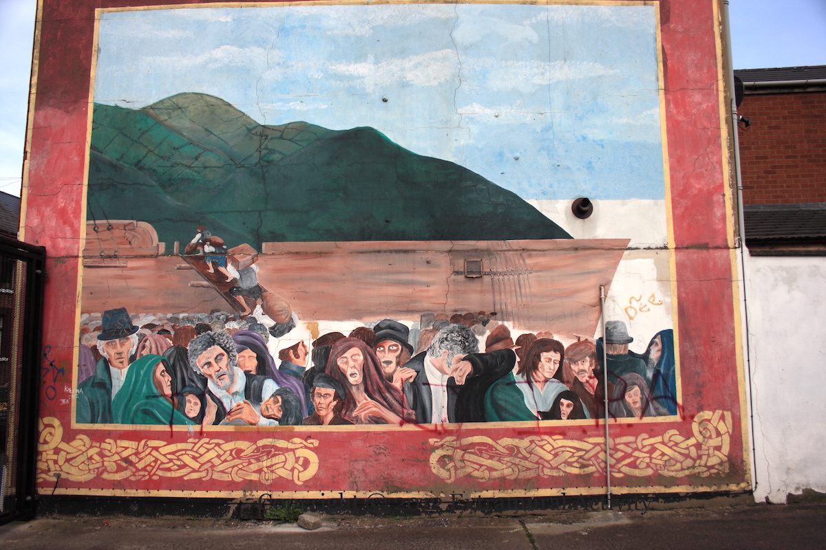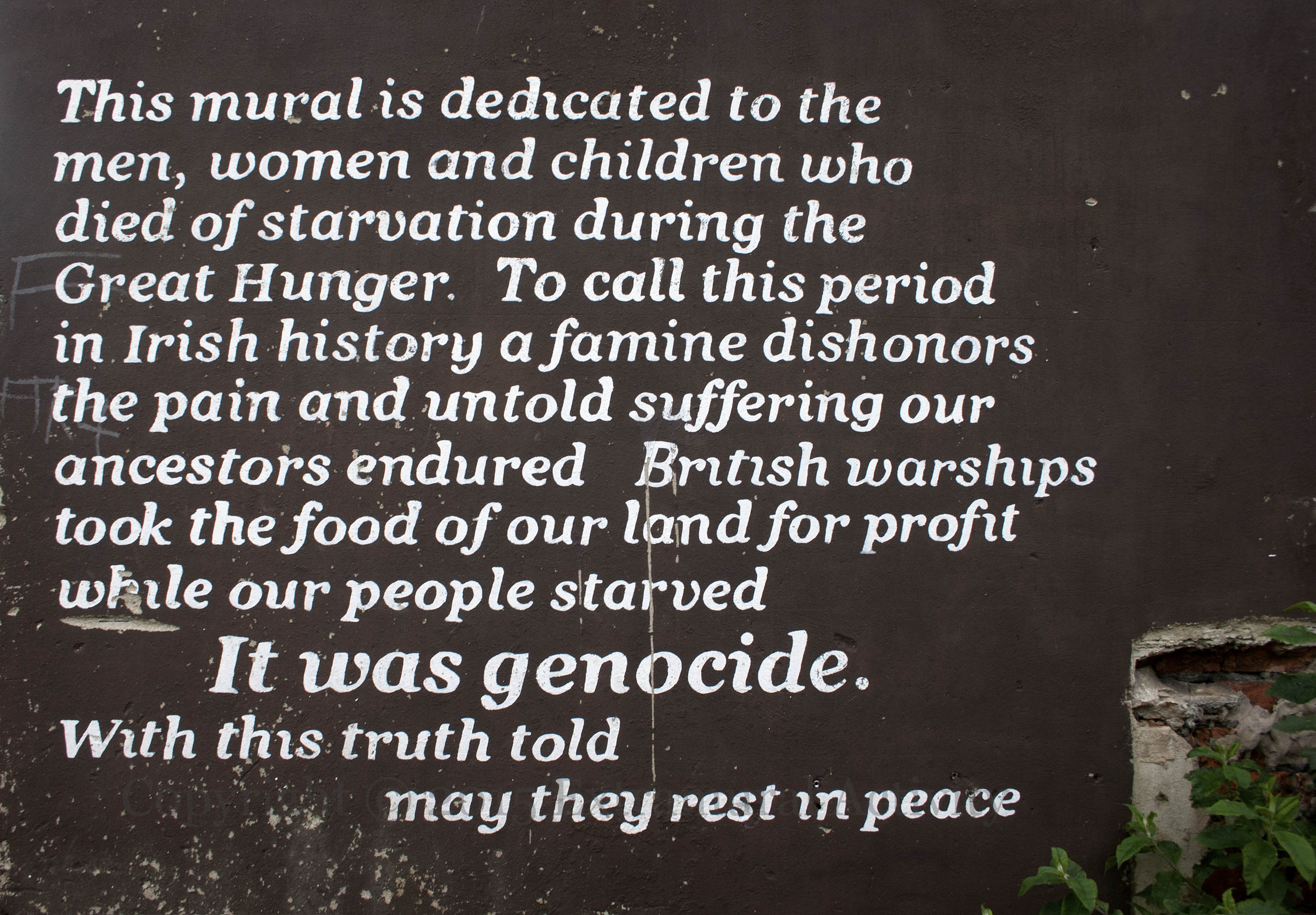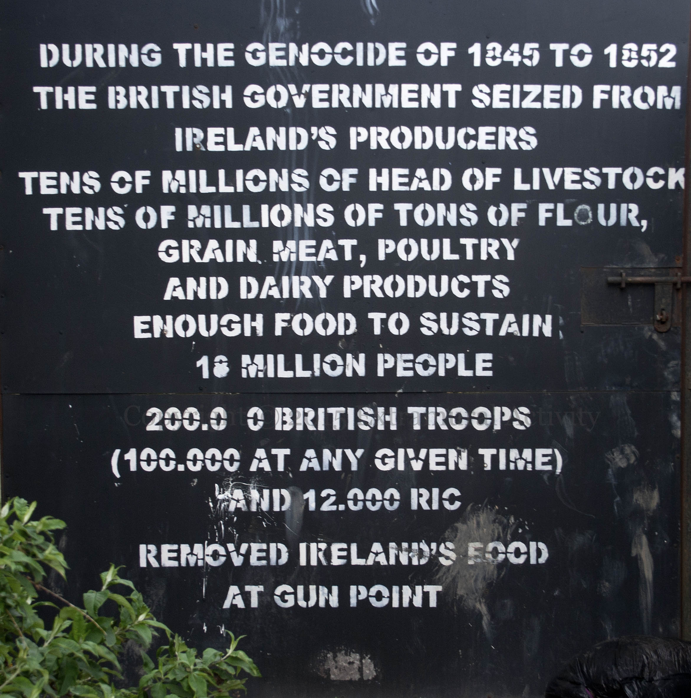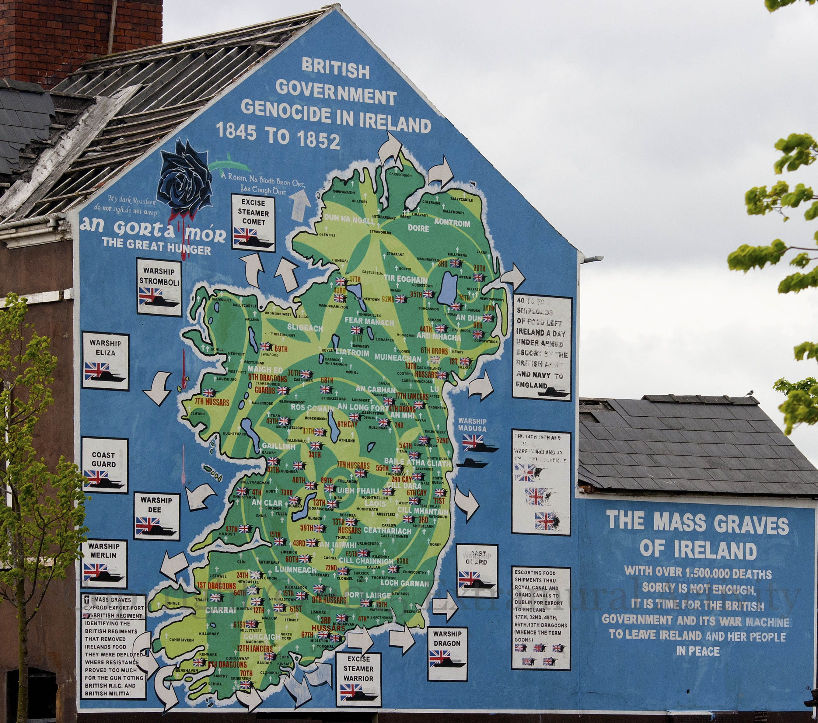 The mural above asserts that it was not merely a matter of negligence but of will: “With over 1,500,000 deaths “sorry” is not enough. It is time the British government and its war machine to leave Ireland and her people in peace. During the genocide or 1845 to 1852 the British government seized from Ireland’s producers tens of millions of head of livestock, tens of millions of tons of flour, grain, meat, poultry and dairy products, enough food to sustain 18 million people. 200,000 British troops (100,000 at any given time) and 12,000 RIC removed Ireland’s food at gun point. This mural is dedicated to the men, women and children who died of starvation during the Great Hunger. To call this period in Irish history a famine dishonors the pain and untold suffering our ancestors endured. British warships took the food of our land for profit while our people starved. It was genocide. With this truth told may they rest in peace.”