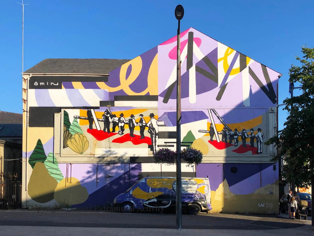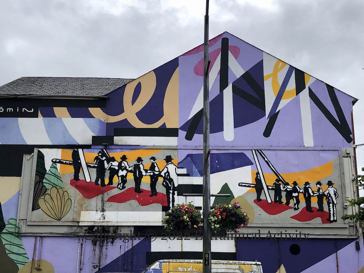 A shortage in low-income housing is highlighted in the #buildhomesnow campaign which has put up lots of small boards (such as the one in the image below, on Divis Street) and the mural shown above, which is in the New Lodge. The site of the old Mackie’s factory is one particular location the campaign says could be redeveloped. (See articles from BMG and Participation & Practice Of Rights.)