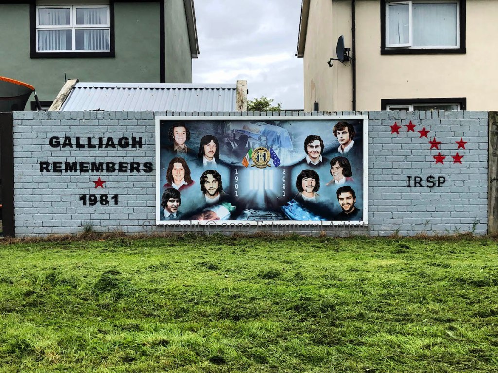 This installation in Galliagh, Derry, has a portrait of each of the ten deceased 1981 hunger strikers on a large “H” as well as the central board shown above – the coffin being carried is that of Kevin Lynch – see For A Socialist Republic.