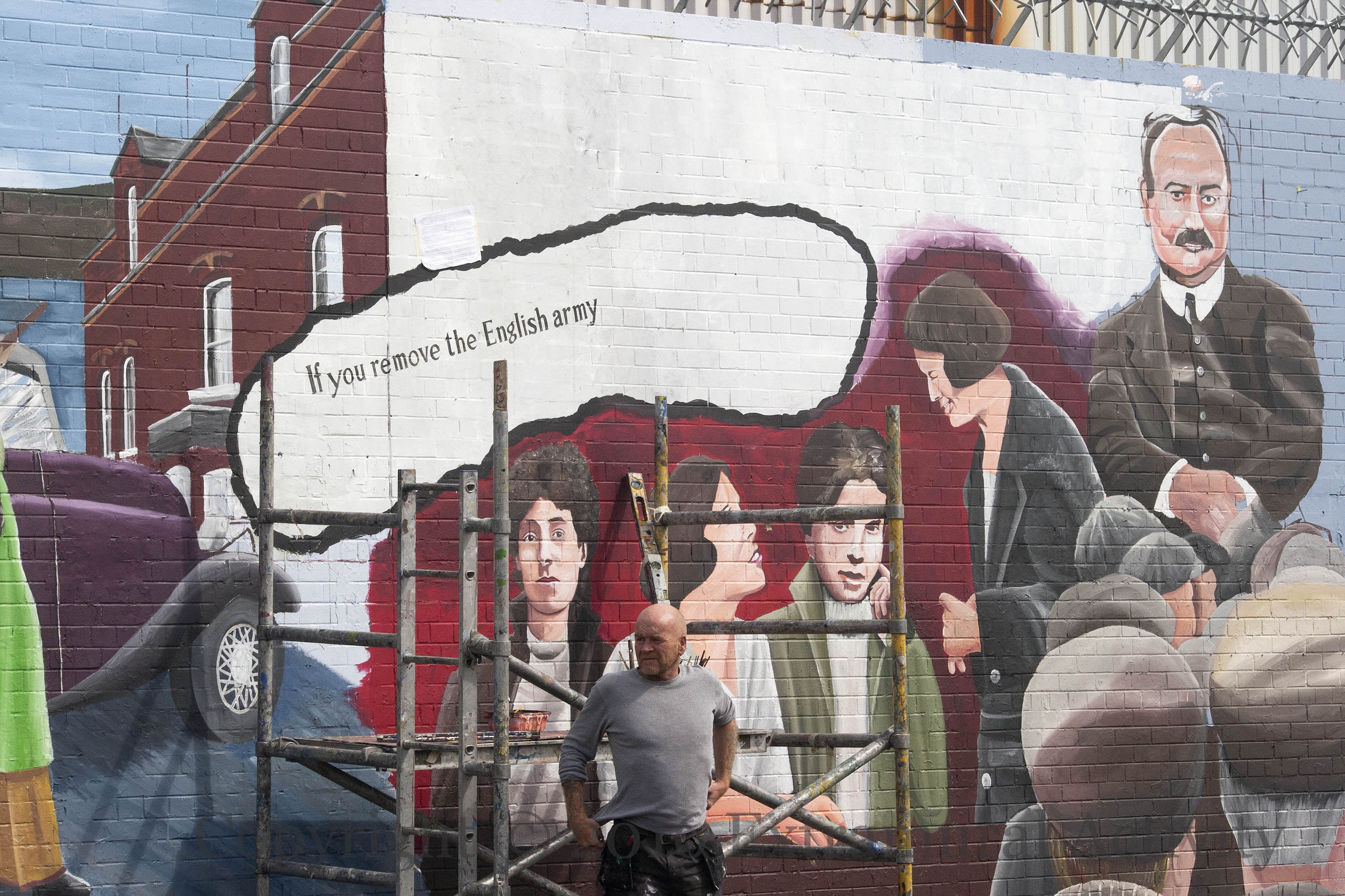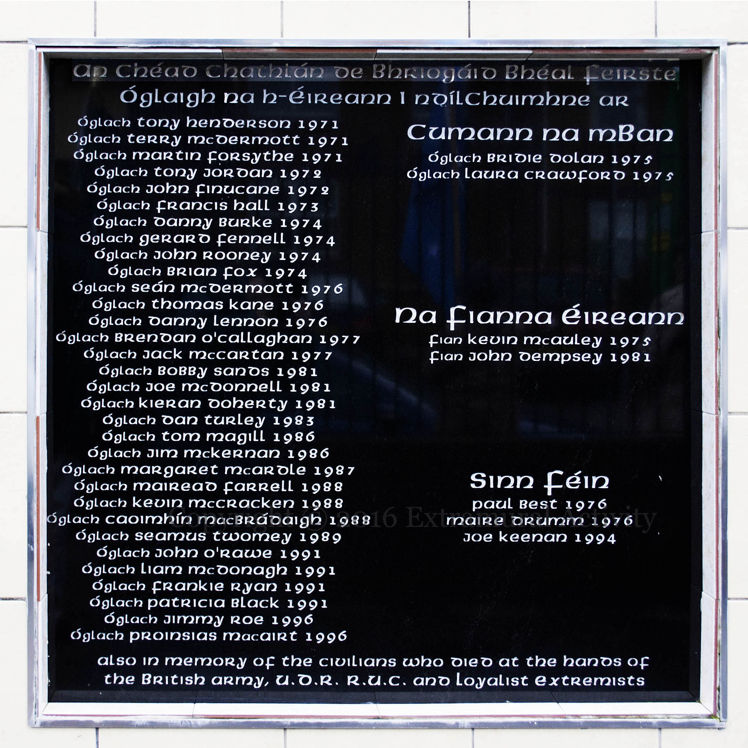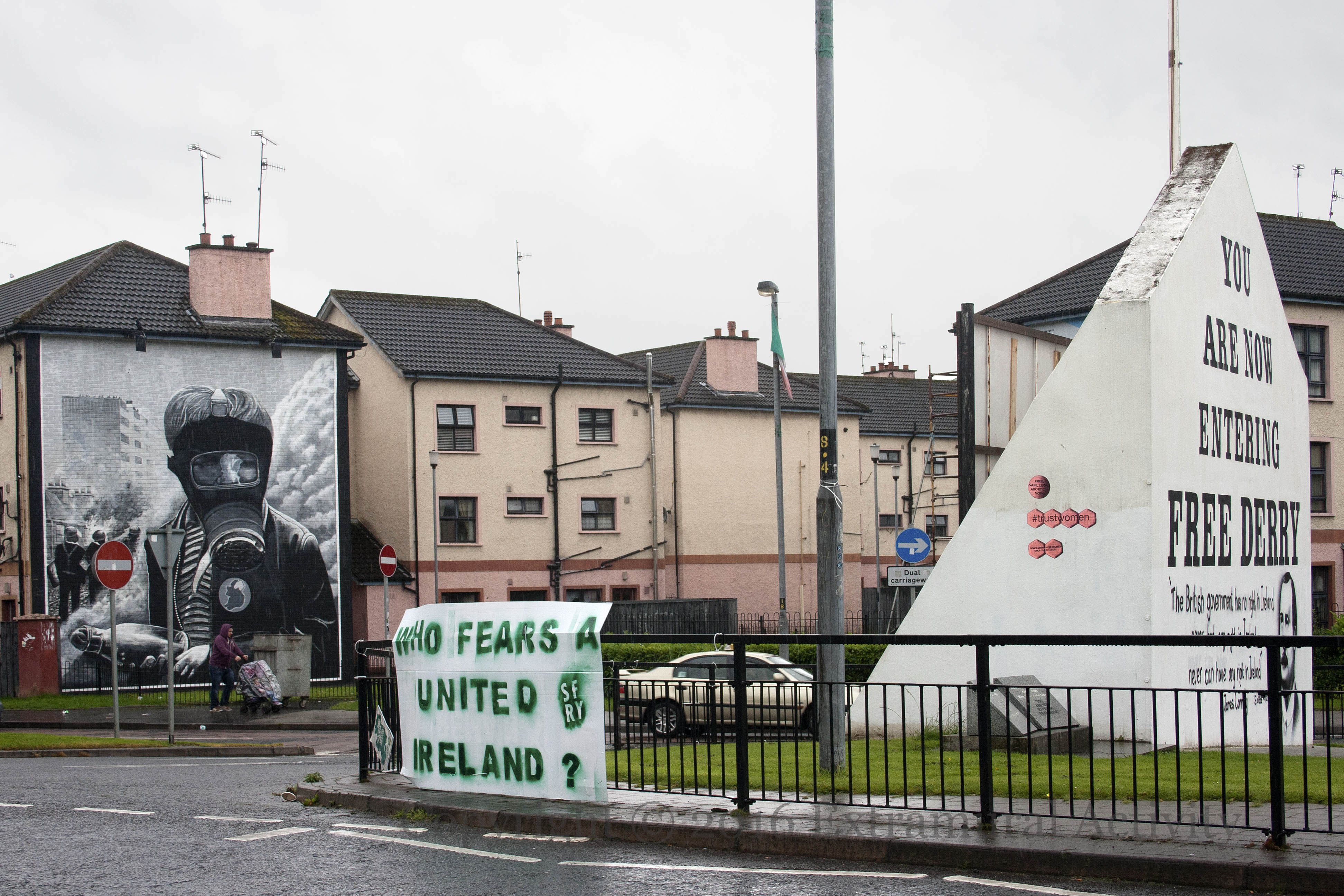 The night before he was executed for his part in the Easter Rising, republican leader James Connolly (5.6.1888-12.5.1916) penned a brief statement calling the British presence in Ireland “a usurpation and a crime against human progress” and declaring “The British government has no right in Ireland, never had any right in Ireland, never can have any right in Ireland”. Here are two images of Free Derry corner with Connolly’s quote, including The Petrol Bomber by the Bogside Artists and and “SFRY” (Sinn Féin Republican Youth) banner on the railings.