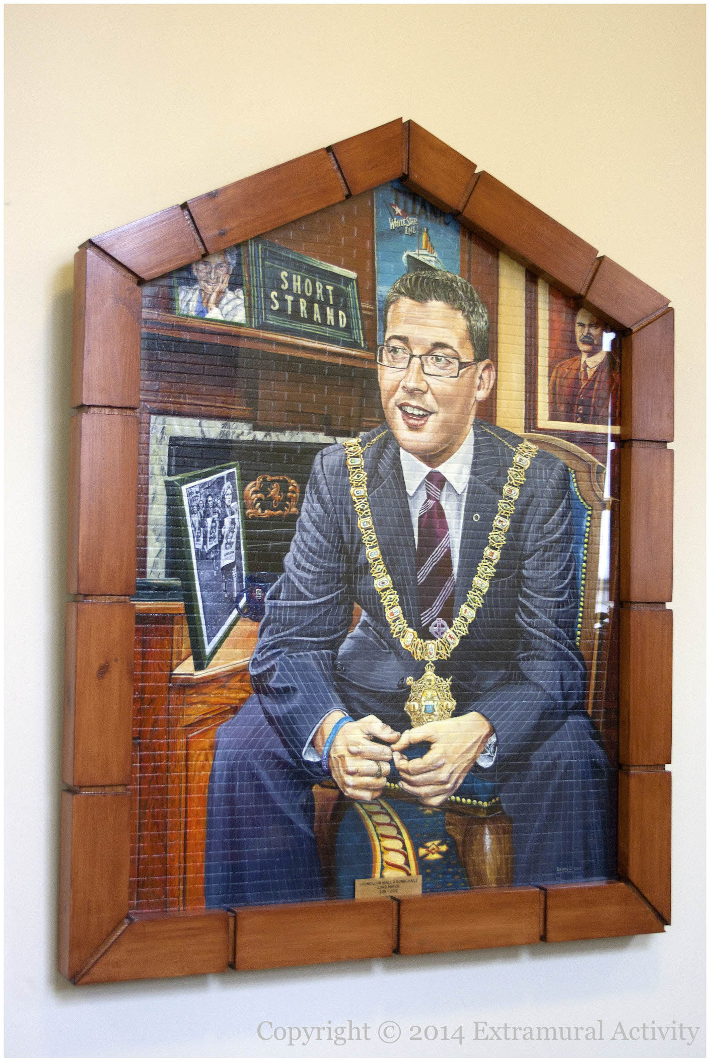 Each Lord Mayor of Belfast has an official portrait which hangs in Belfast City Hall. 2011-2012 Lord Mayor Nıall Ó Donnghaıle’s takes the unusual form of a mini-mural, in the shape of a gable wall and complete with mortar lines. The portrait features a “Short Strand” street-plate (Ó Donnghaıle is from there), images of Titanic, James Connolly – a portrait was mounted at a SIPTU event in the mayor’s chambers in October 2011, after pictures of the royal family had been removed in June, protesters, and an MTV mug. The artist talks about the piece on Slugger (audio) and CultureNI has a good write-up about the process.