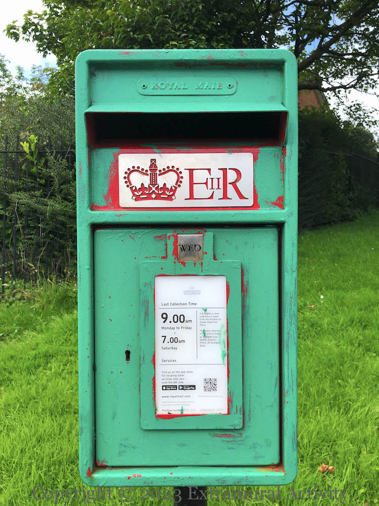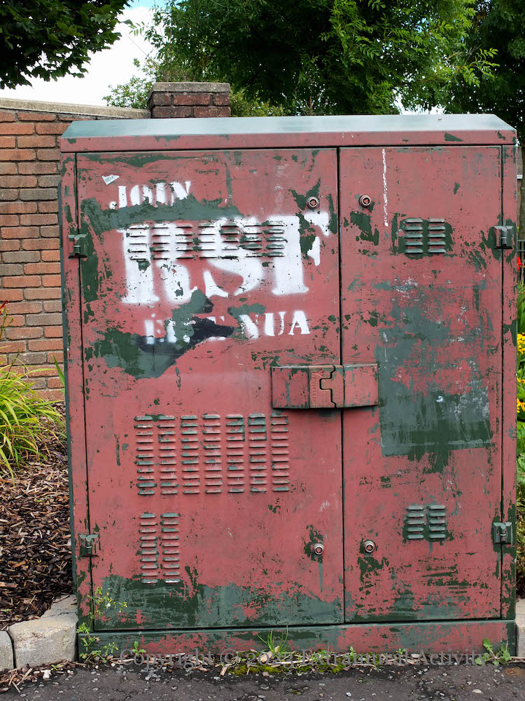 Red and then green and then back to red, at least in part. This “Royal mail” post-box is at the entrance to Glencolin, west Belfast. With bonus “Join RSF – Éıre Nua” stencil on the electrical box across the street.