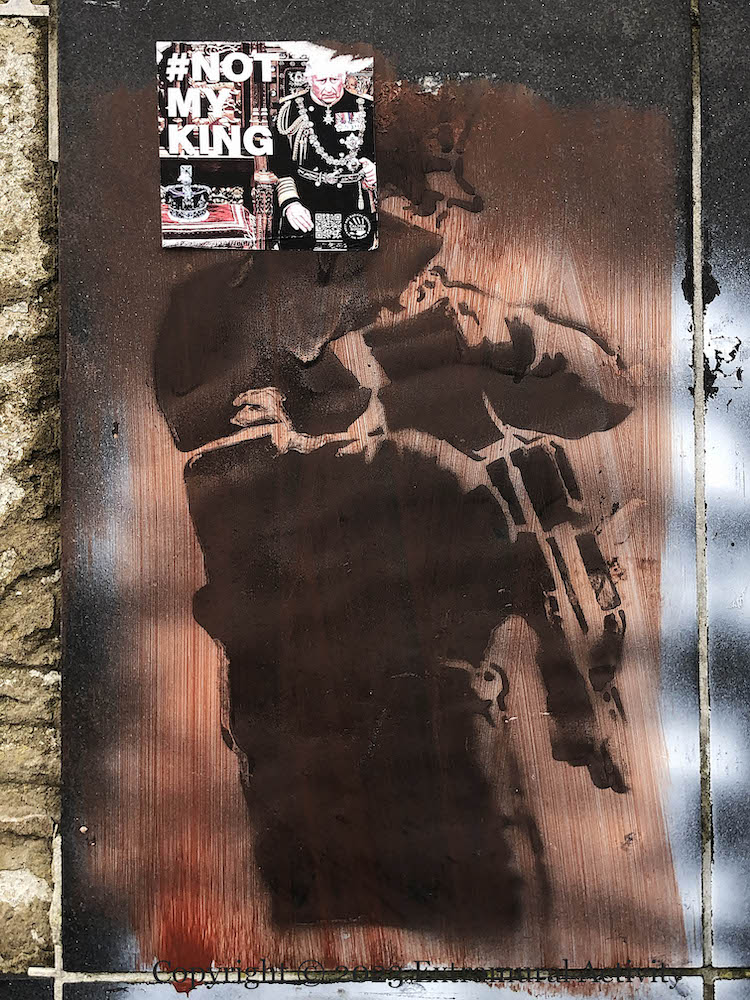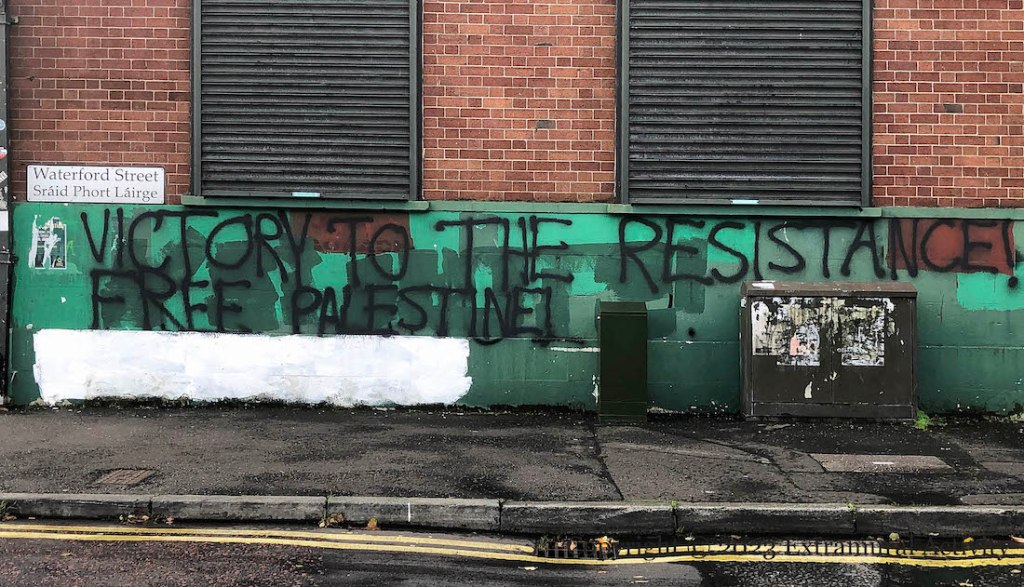 These images were taken in the lower and middle Falls, west Belfast. As might be expected, there is some reaction to the current conflict between Hamas and Israel: “Victory to the resistance – Free Palestine!” and “#NotMyKing” are at the closed-up Mac Diarmada club at Sráid Phort Láirge (see previously: CIRA GHQ); “Israel get out of Ireland” is on a crossing button in Beechmount.