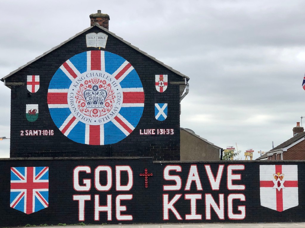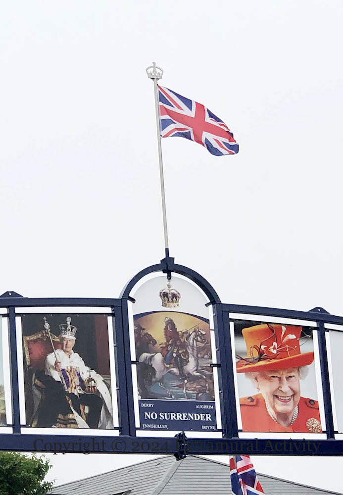 The two passages cited here have been cited before on the side wall at the junction of the Limestone Road and N Queen St, with images of Orange symbols and Union Flags, in order to promise that Your Kingdom Will Endure Forever. That theme has now been invoked in upper Tiger’s Bay, to celebrate the latest king (Charles III) of the everlasting kingdom demarcated by the shields of the “four nations” in the corners of the main gable, Northern Ireland included.