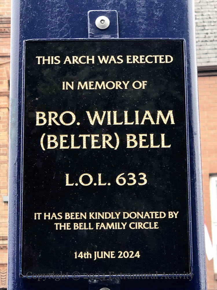 “This arch was erected in memory of Bro. William (Belter) Bell, LOL 633. It has been kindly donated by the Bell family circle. 14th June 2024”
